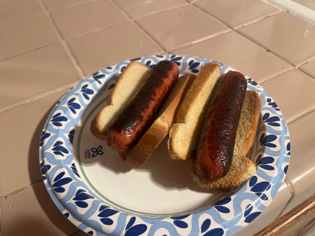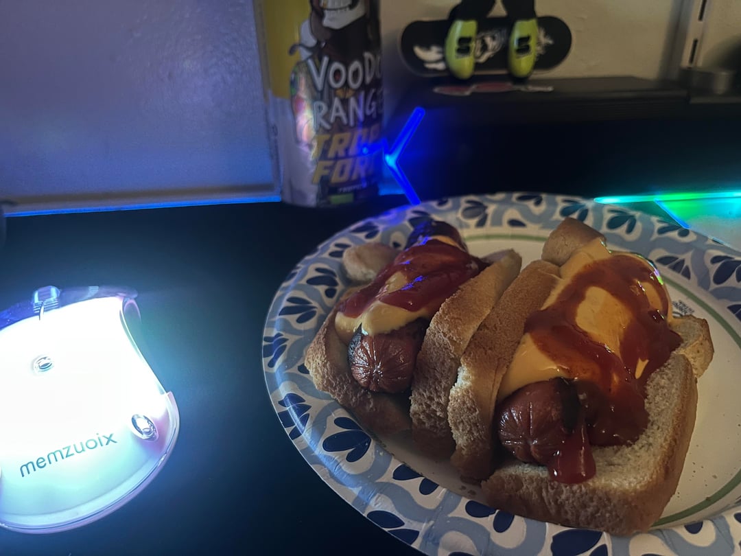 yes i’m still drunk. uhm… i’m trying to make this boo-jee like those other posts. haha only 2.5 drinks and a meal. this is simple, white bread. bar s links. tostinos “salsa con queso” cheese dip. ketchup and tapatio hot sauce. watching Deadpool & Wolverine while playing some shitty COD BO6 MP. it took me like longer to write this post than cooking the meal 🤷♂️