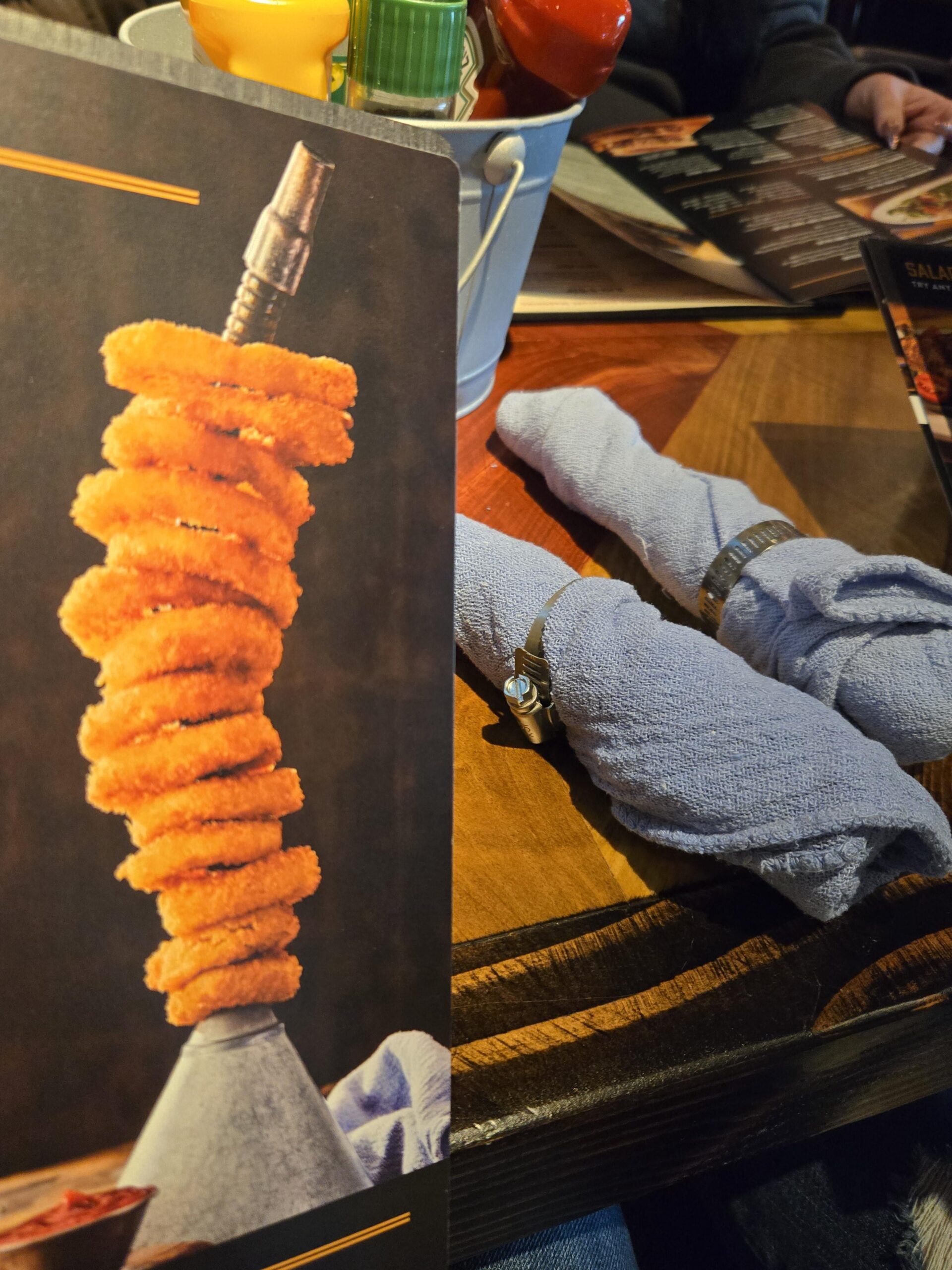 A funnel of rings, shop cloth napkins, and hose clamp napkin rings. First post on this sub.