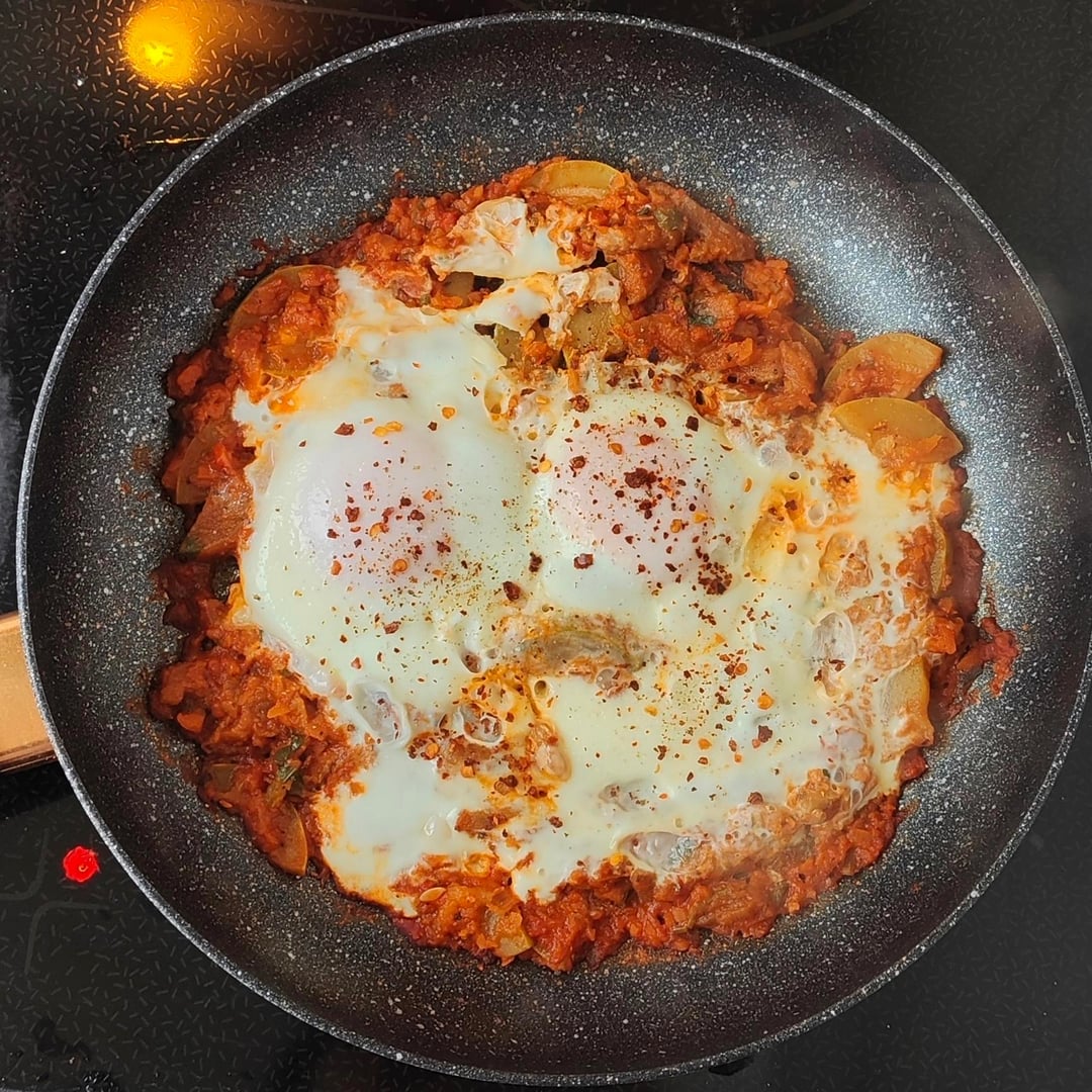 breakfast: leftover ratatouille sauce (124c) with 2 eggs (172c)