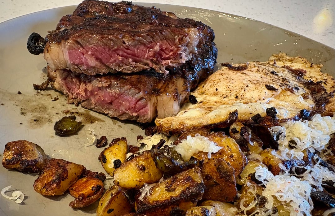 Ribeye grilled directly over B&B briquettes with a couple chunks of hickory. Little more gray band than hoped but still hit a nice medium rare I was looking for and very tender. Eggs & potatoes on the side! by bobbarkerbassface 4 Comments jbueno9869 8 hours ago Looks awesome Dracawraith 7 hours ago I, too, like rib eye with eggs… Alternative_Speed_72 6 hours ago Perfect start to your day. tbs999 5 hours ago Looks delicious!