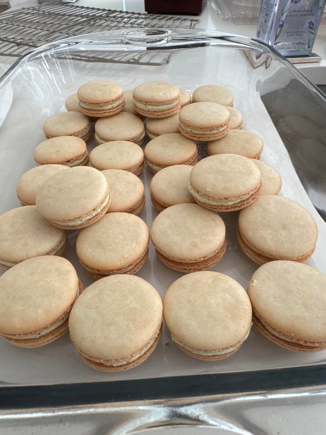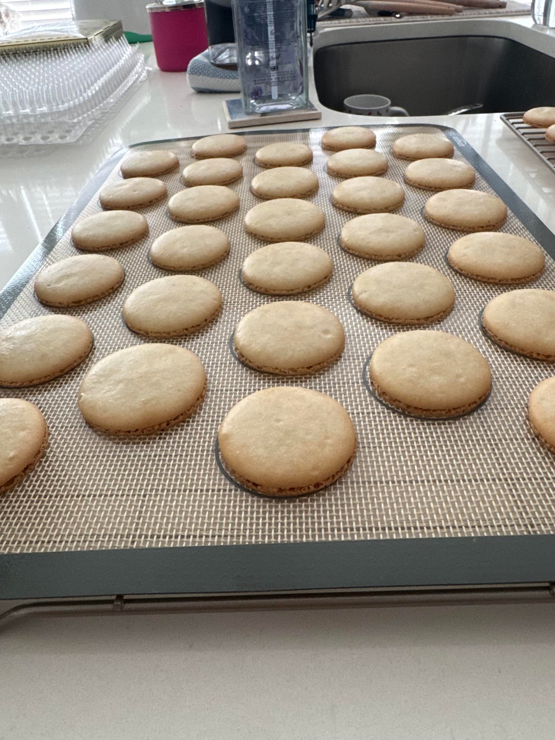 So apparently my oven runs 10° hotter than what I set it at (got an oven thermometer) so at 14 minutes I took out the tray with two shells missing (pic 1) and it definitely seemed a little overcooked and for my second tray I took it out at 13 minutes and they look better (pic 2) but I feel like it’s still too hot for them. I’m thinking about dropping the temperature, from 315° to 305° (so it’ll actually be 315°), and seeing if that helps. Do they look ok to y’all? Any advice? I assembled them (they’re vanilla with pistachio buttercream) and am bringing them to work, hopefully I’m not judged too hard 😂