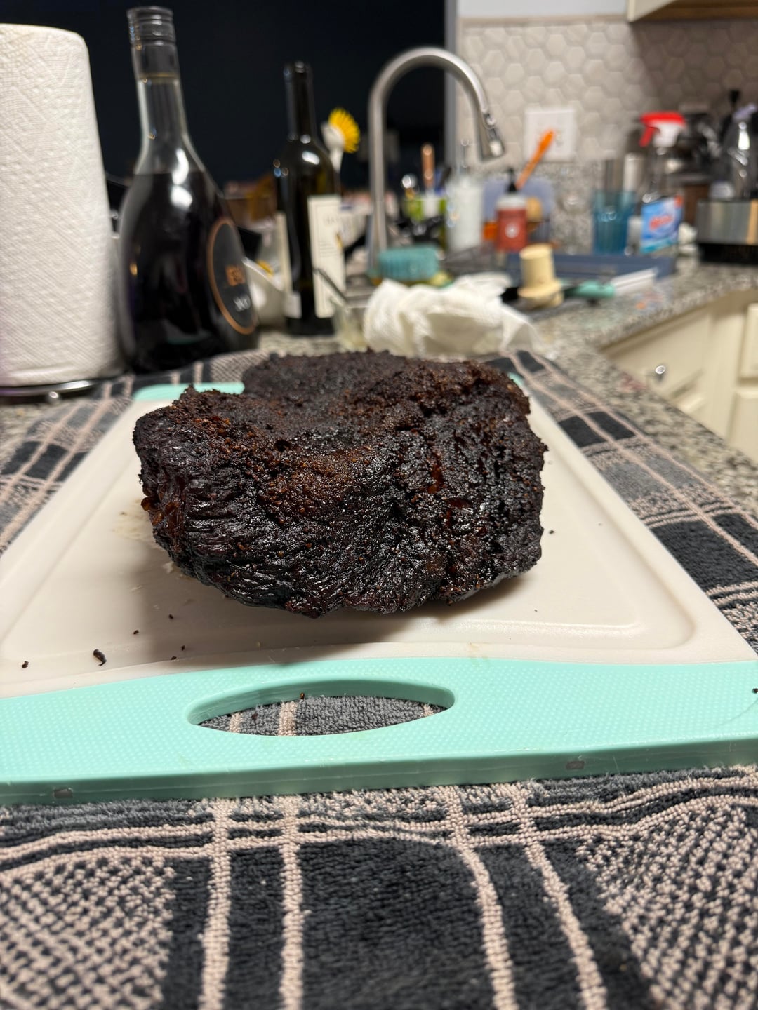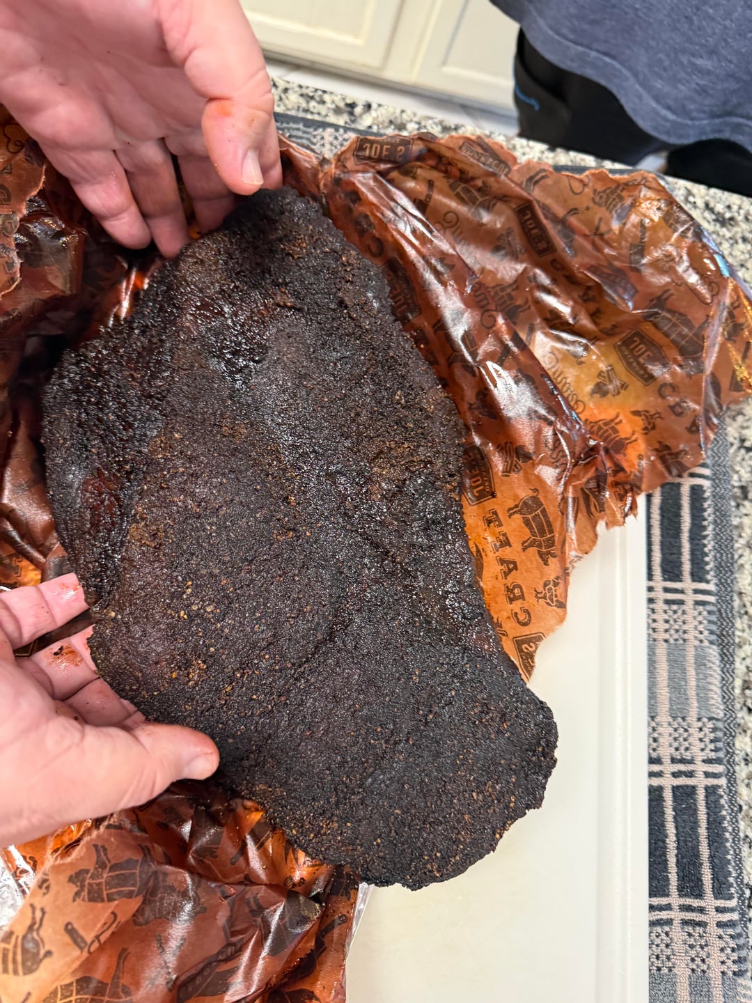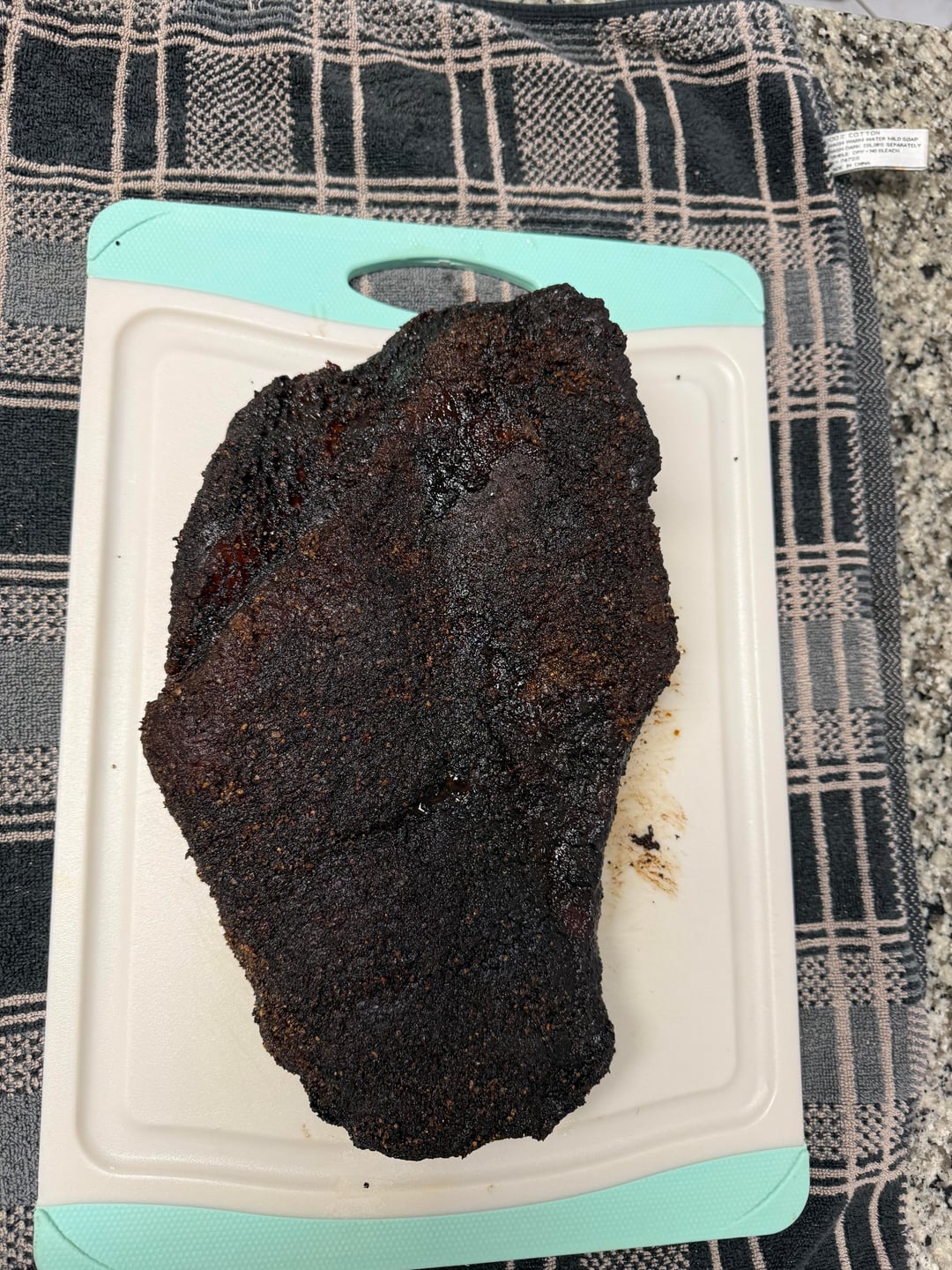 Judging the bark in the dark, even with a flash light and porch lights was a bit difficult. I probably could have wrapped it and put it in the oven around the 5 hour mark picture 1 and been reasonably happy but the extra time really did improve the bark.