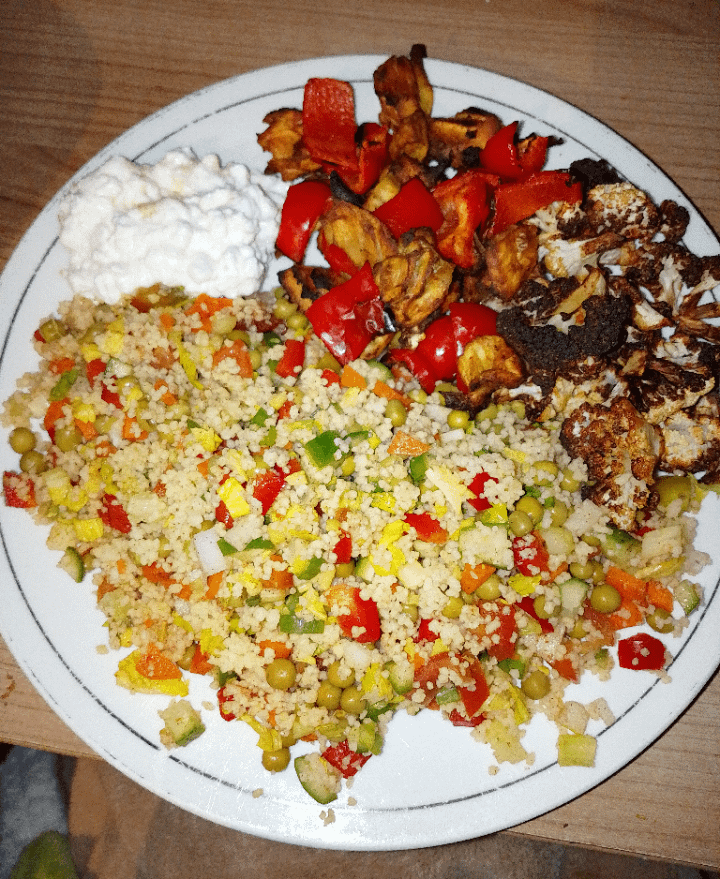 360 calories for the entire plate seems okay I think? It's couscous salad (basically just couscous with every random vegetable I could find), airfried cauliflower (first time trying, totally burned it unfortunately), a mix of bell pepper and plant based chicken and a blob of cottage cheese