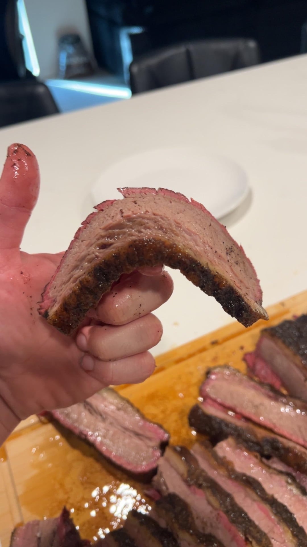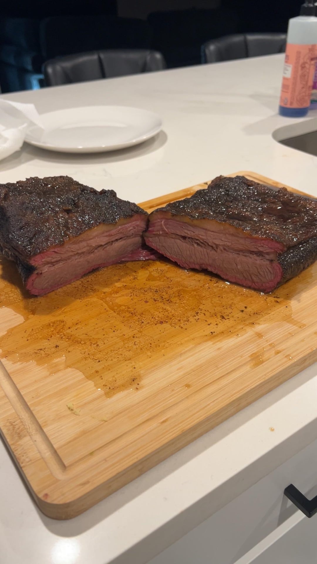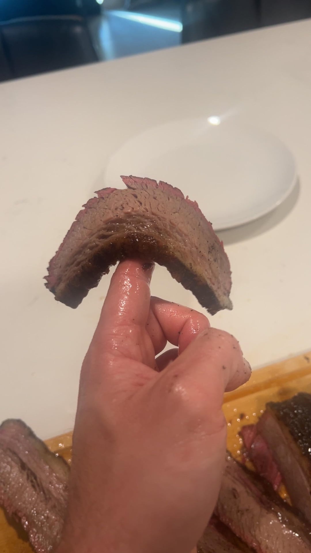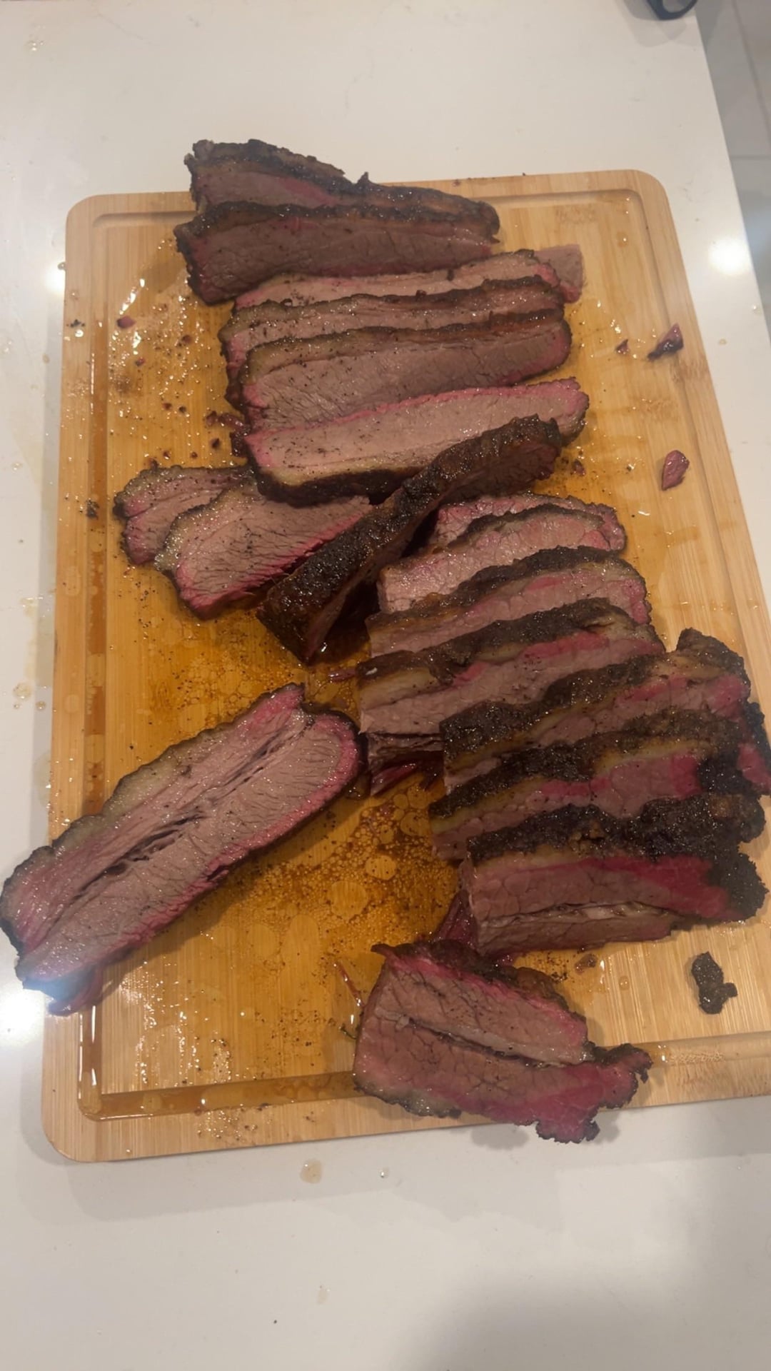 Yesterday I posted a brisket I snagged from Walmart to cook for the family on Thanksgiving. It was tagged as Select , about 10lbs, $48. After some thought and feedback, and the fact I’ve never smoked a brisket before. I decided that I’ll grab a nicer piece of meat for the family, since ya know they’re family and their opinions matter to me and I’ll cook this one for myself and experiment. It was pretty mangled up when I took it out of the package, trimmed it up, salt and pepper and threw it on. 180-190 for 8 hours, wrapped for about 2 hours, maybe a bit more at 250 until the internal was at 205. Rested in a cooler for an hour and since I wasn’t quite ready to eat it yet I rested it at 170 in the oven for about 5 hours. Overall I am very happy with the outcome. Tender, juicy, and very flavorful. Not dry. Some parts were a bit drier than others, but still wouldn’t say dry. It didn’t quite melt in my mouth though, it was a bit rubbery. Maybe from resting in the oven? Didn’t cook long enough? Or cooked too long unwrapped? Or overall quality of meat? Im not sure, but it was more than edible and I’m not disappointed with my first brisket. Picked up a 15lb prime brisket from Costco for $89, looks a lot nicer, which will now be for Thanksgiving.