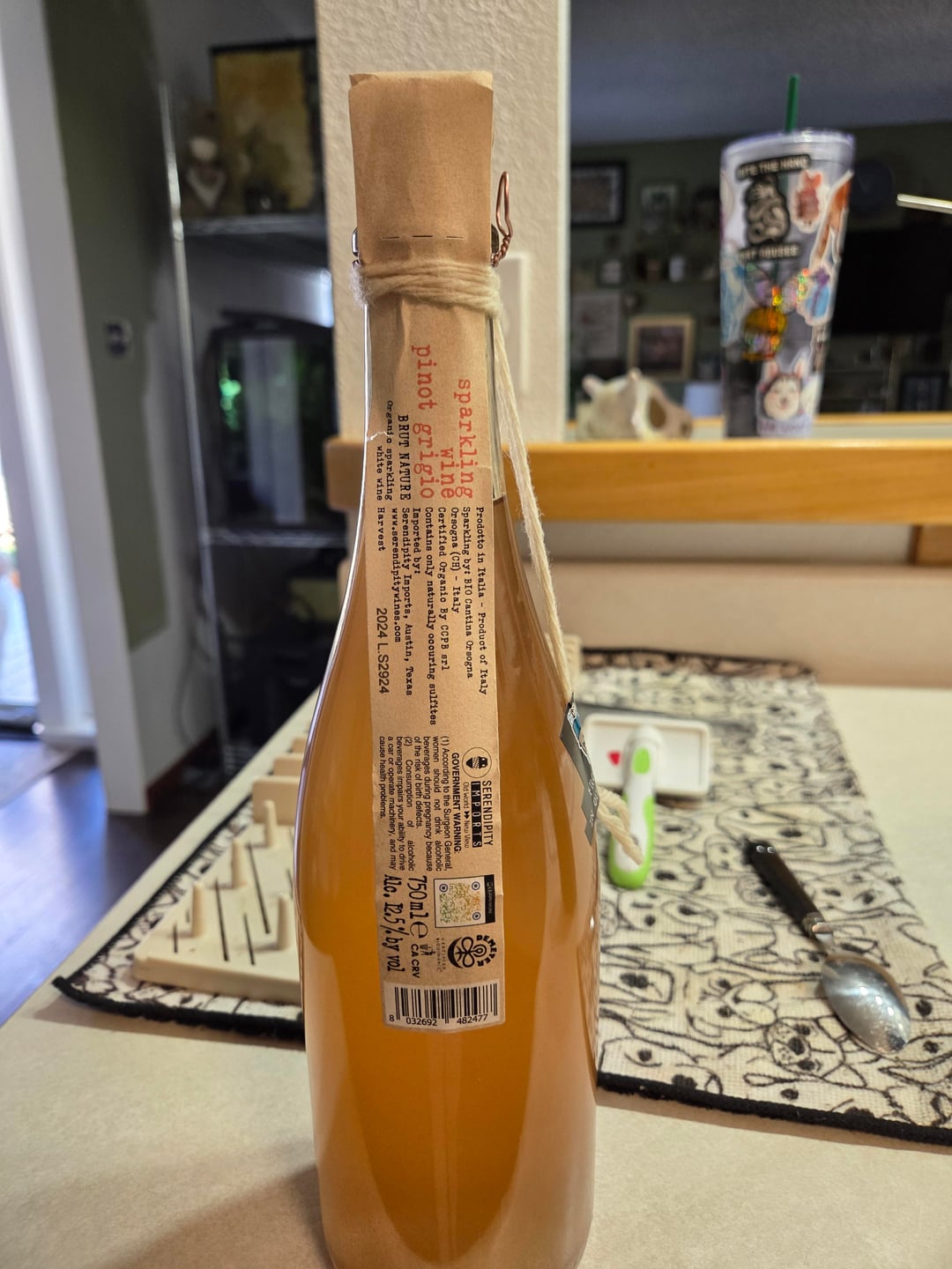 What you have is an orange pét nat of pinot grigio from italy. The grapes are grown by usda organic and Demeter biodynamic standards, which means this wine was created in a very natural process.