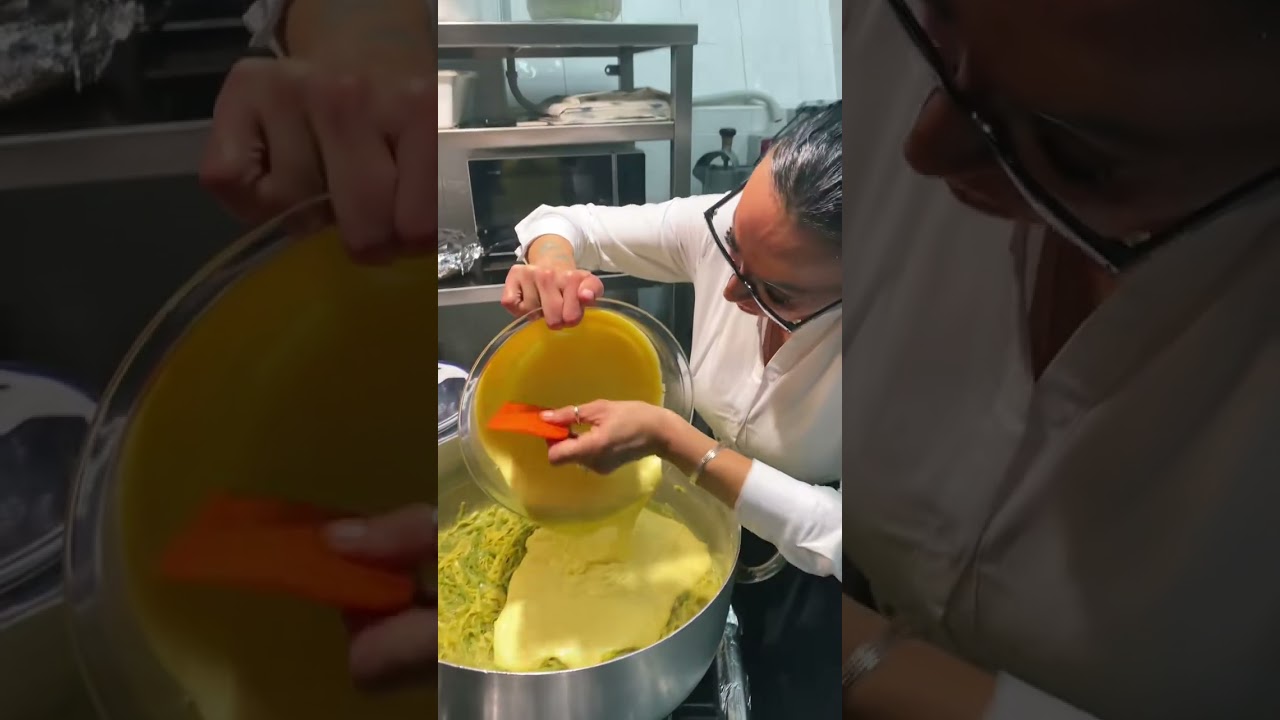 Oggi facemmo paglia e pieno, un mondone. Sto scherzando. Tagliatelle paglia e fieno, pancetta croccante che mo vado a fare nel forno e crema di parmigiano allo zafferano e due. Per fare queste tagliate le paglie pieno, un po’ di cipollina, fate soffriggere e ci buttate i zucchini tagliati piccoli piccoli. La pancetta, guardate, diventata bella croccante. Nel boccale del mixer mettete un po’ di basilico e le zucchine che avete cotto prima e frulliamo tutto. Guardate che bella paia di zucchine che è venuta, ragazzi. pochissima acqua e pochissimo sale e cical calate le tagliatelle. Qua vedete l’acqua deve essere proprio poca poca poca poca perché queste tagliatelle cuociono giusto 2 minuti. Vedete? Guarda, vieni, si è asciugata tutta l’acqua. Adesso ci mettiamo la crema di zucchine e facciamo amalgamare 5 minuti. Qua crema al parmigiano e zafferano guagliù. Una cosa proprio mamma mia, una specialità. pancetta croccante. Guardo ed è di napoletanità, basilico e pecorino. Tieni qua viì. Mamma mia! due a me, eh. Mangi tutte così paura. Ча.