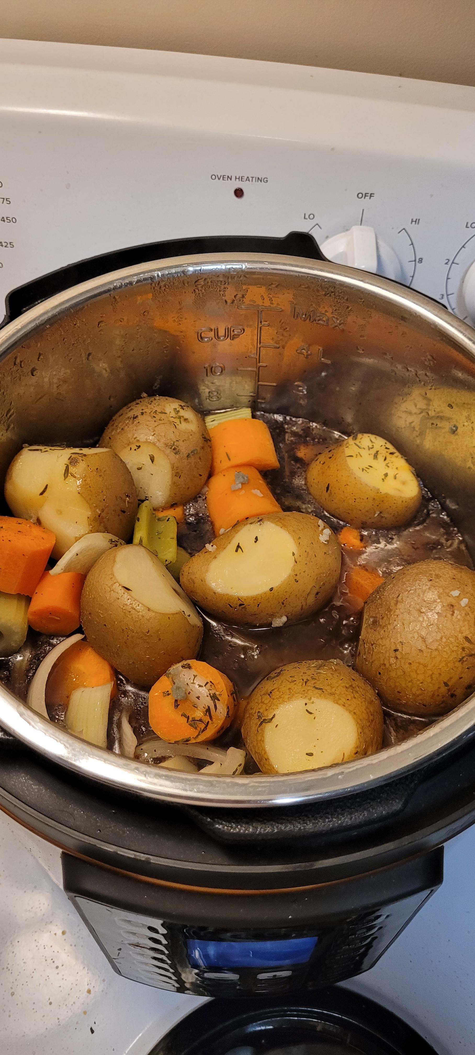 you can go either way technically. Its all in how you like it. My mom cooked it on the stove top in LOTS of liquid for about 1 hours, then she’d add the veggies after that and cook for another hour or so and there’d be lots of liquid for a gravy afterward. You take all the stuff out and boil the hell out of it and add a flour/water mix till it thickens with seasonings to taste. SO good for dipping bread into.