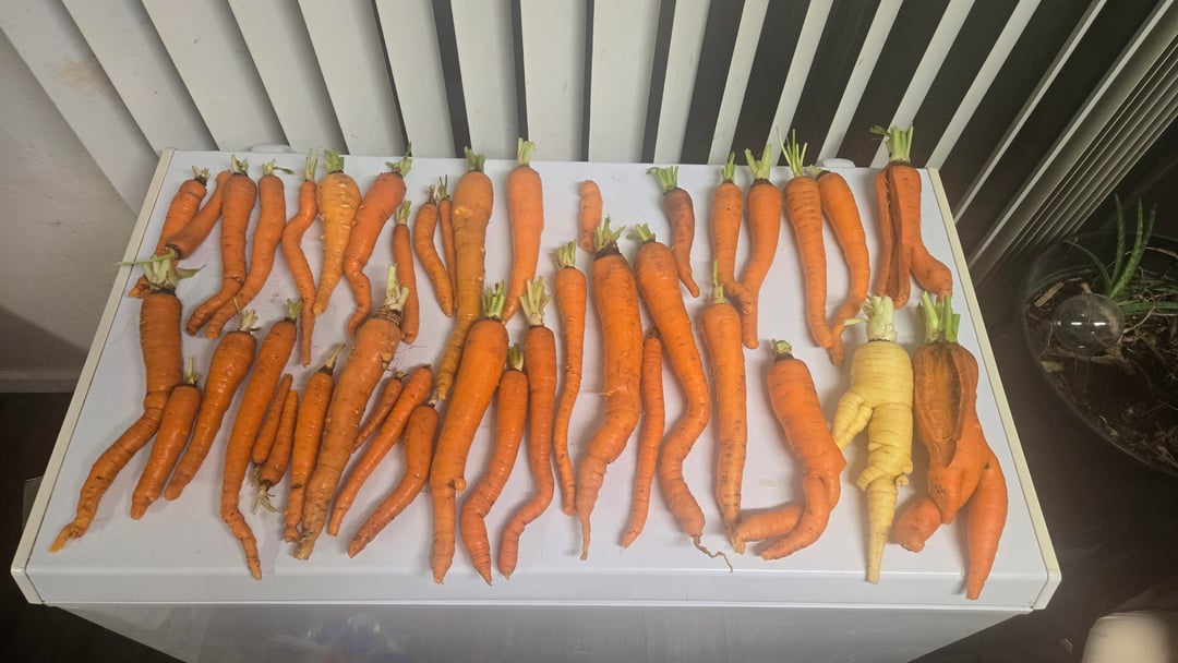 By not thinning them out, but good god, look at the length of some of these! SO… MUCH… GREENS. Question, are the one that split open still good? Or are the to woody?by darkpheonix262 3 Comments jh937hfiu3hrhv9 20 hours ago Good harvest. Cut off the brown parts and the rest is good carrot. The yellow one looks like queen anne’s lace which are woody and tasteless. babytotara 19 hours ago I use the split ones if I can scrub them clean. Prestigious-Wolf8039 19 hours ago The one next to the white one really needs to go the bathroom.
