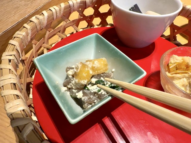 There are also small seasonal dishes, and when we visited, we were able to enjoy the autumnal flavours of Persimmon and Konjac Shiraae (mashed tofu salad).