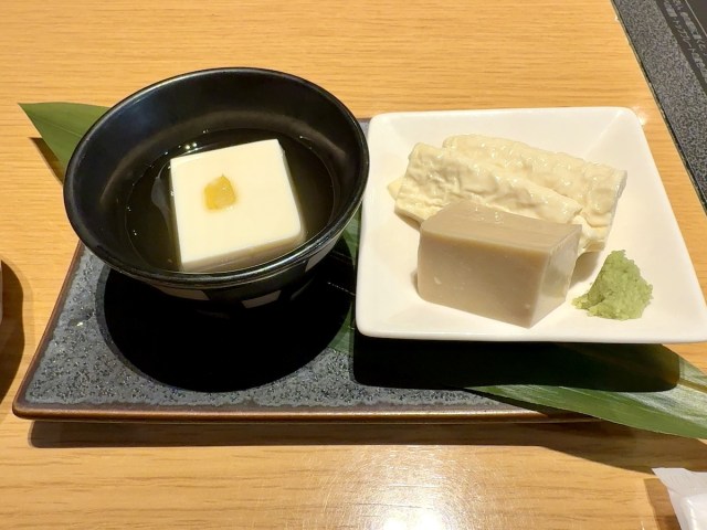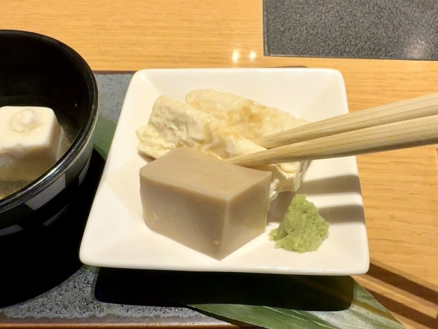 The first thing to arrive at the table were the appetisers: yuba sashimi (fresh, raw tofu skin that’s served without cooking) and sesame tofu.