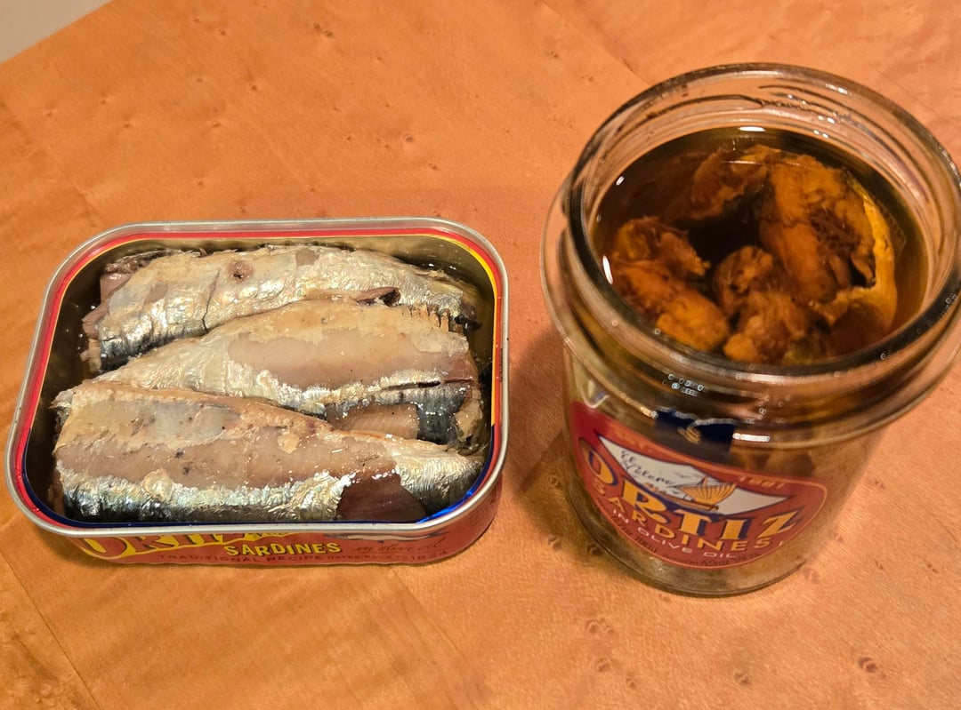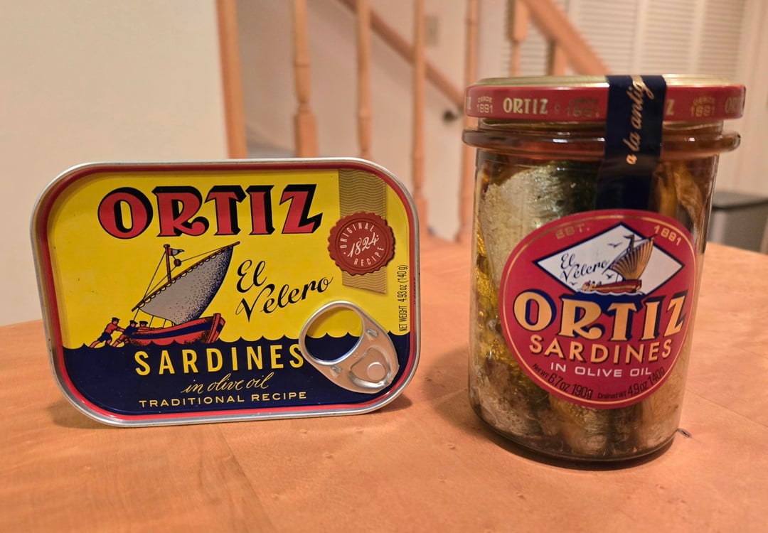 When I learned that my daily-driver canned Ortiz sardines in olive oil were also available in a jar, I was curious about whether they tasted different. The ingredients are identical, but comparing the nutrition info isn't straightforward (unless I get mathy about it, which I have no intention of doing) because the jars hold a bit more than the cans.