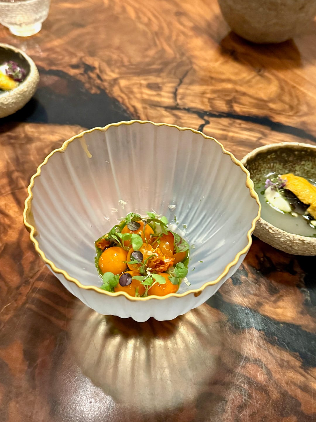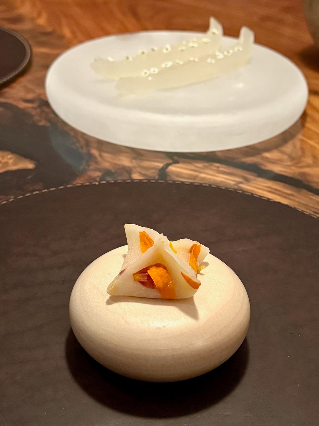 One of the top 5 best things I’ve ever eaten. I love smoky, herbal, and acidic flavors, so this was just perfect for me. Smoky sweetness from carrot and scallop, brightened by lemongrass and lime, finishing with a lingering umami. Amazing textural contrast from the tender scallop against the bursting pearls of finger lime. I literally paused my conversation with my friend so I could savor this dish.