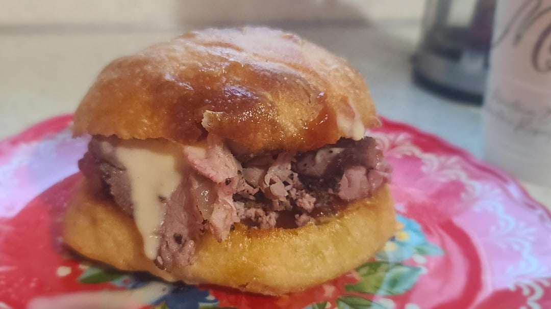 The pic washed out the beautiful pink 😕 however the eye of round was so tender. We had steaks from it for breakfast and it was like eating a perfect NY Strip. The rest we sliced and made mock Arby's beef and cheddar. I sous vide at 133f for 18hrs then seared in butter. Seasoning was salt, pepper and garlic.