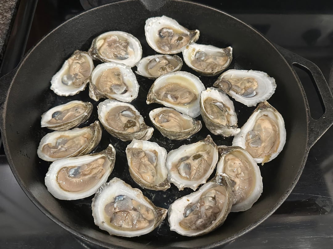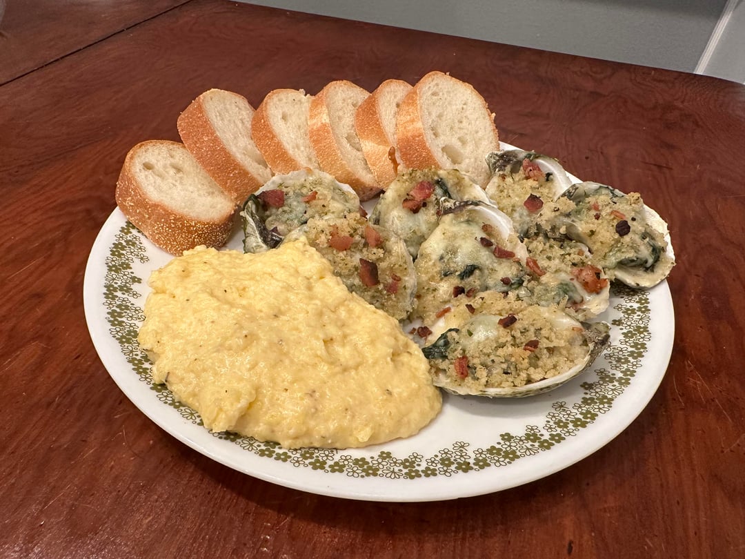 2 dozen fresh shucked East Bay (Santa Rosa Co, FL) oysters. I ate 4 raw on saltines with horseradish and Louisiana hot sauce.
