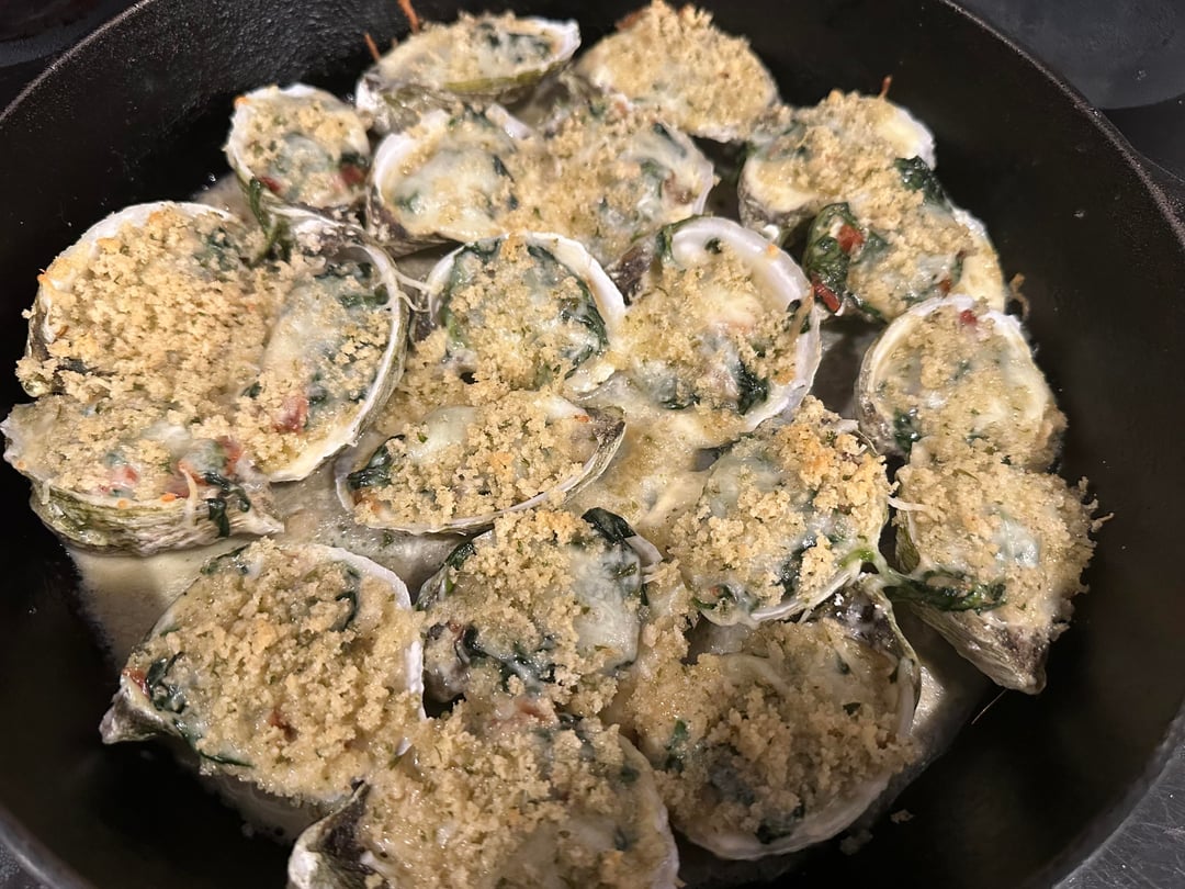 Spoon the spinach mixture into each oyster. Add generous amount of grated Gruyère cheese. Top with panko mixture. Baked for 12-15 min at 375* in a cast iron pan. Top with additional basin pieces when finished baking.