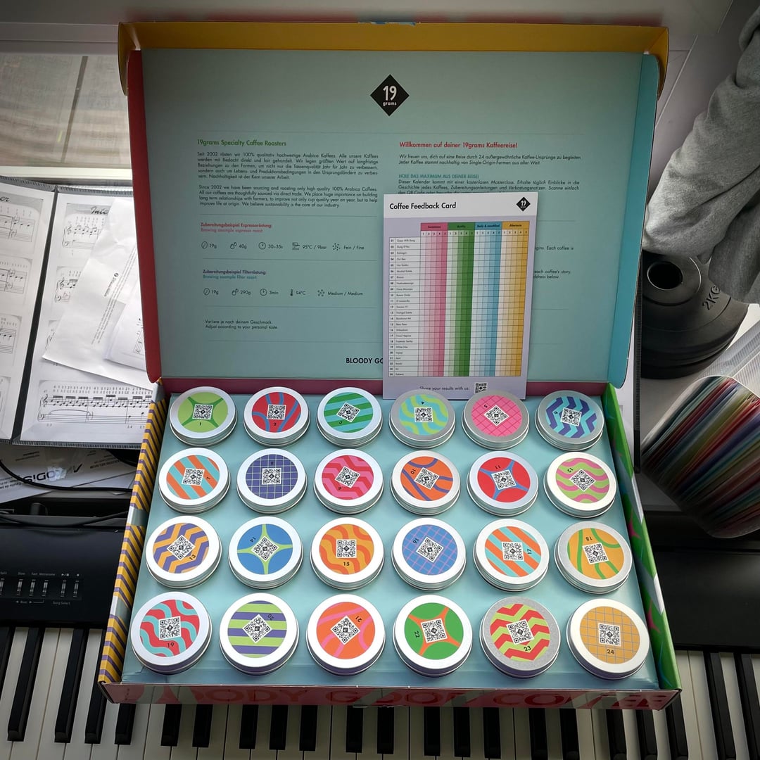 I received my advent calendar from 19grams, I just wanted to share my excitement! That thing is huge, the boxes are 50g each, I could get 3 brews out of each of them! It’s so beautiful and it smells so good! I hope you’ll enjoy yours this year!