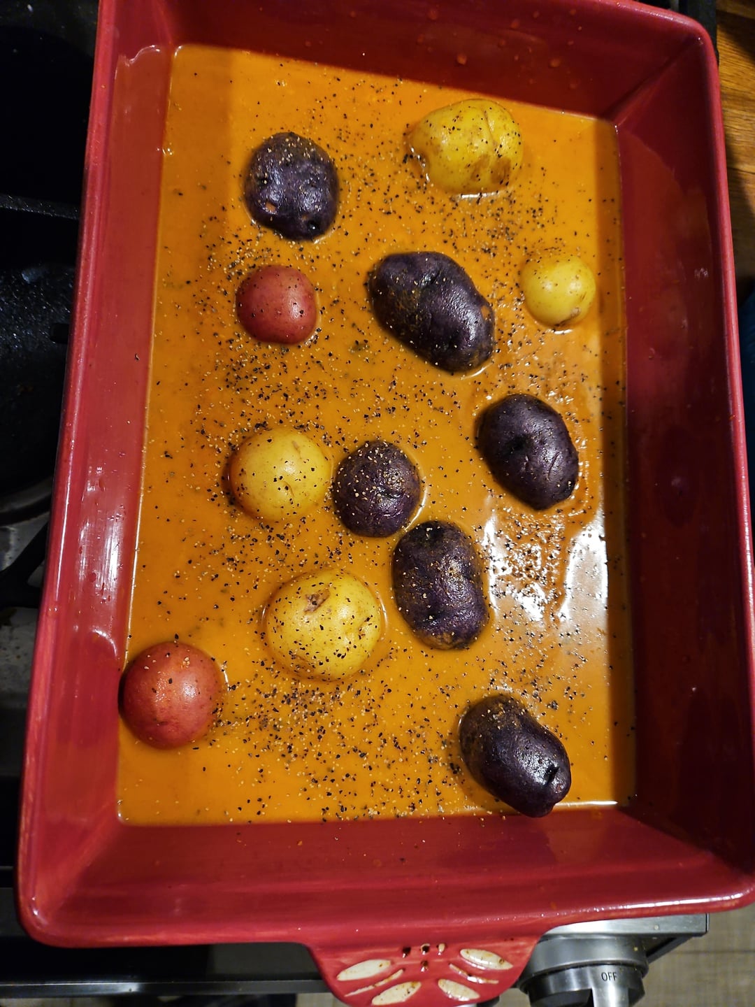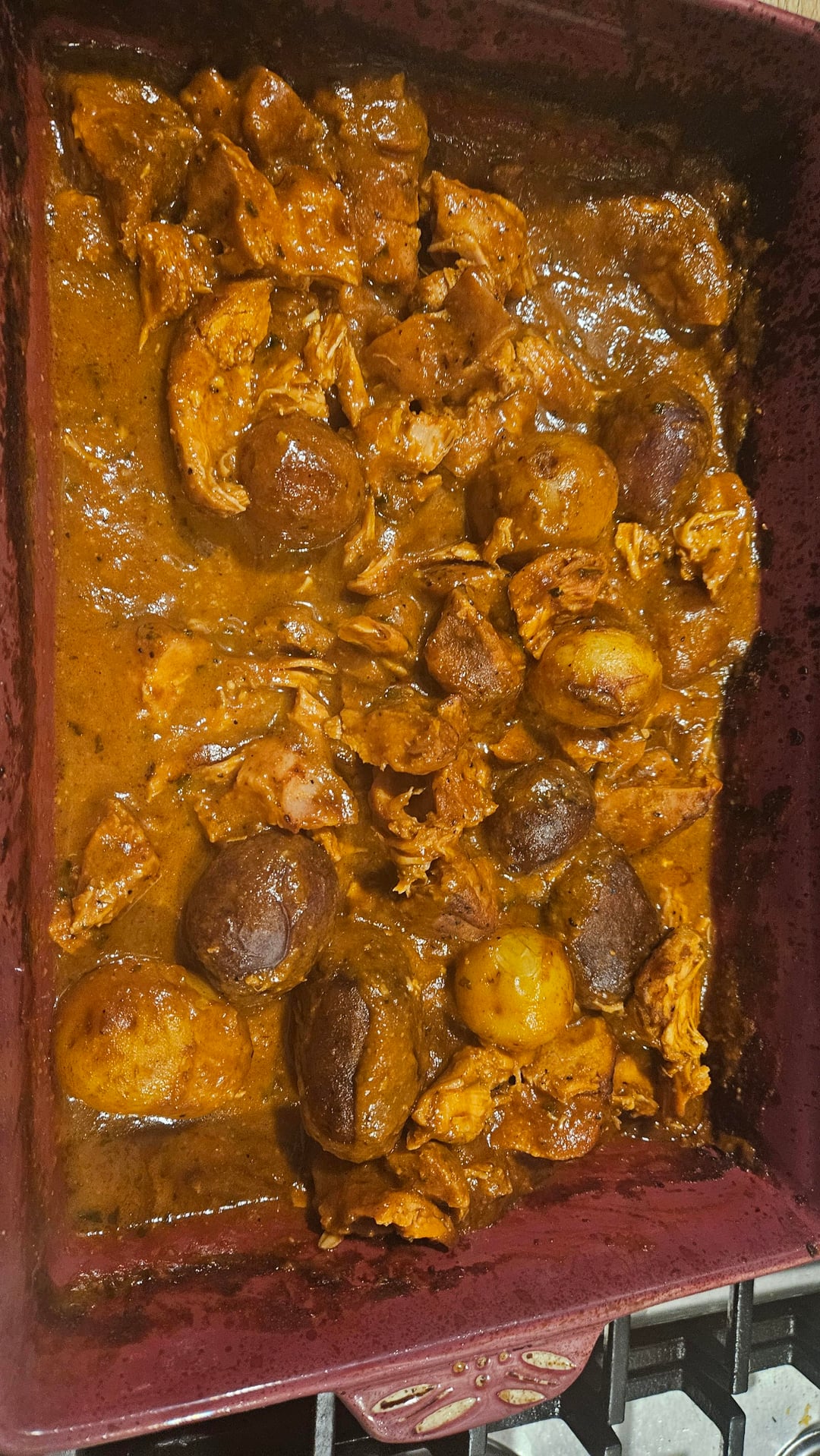 Bottom pan: costco butter chicken sauce, chicken broth (used to shake container and empty allll the sauce out.).