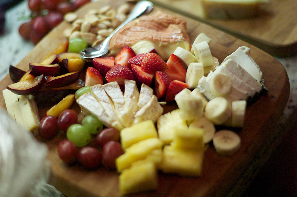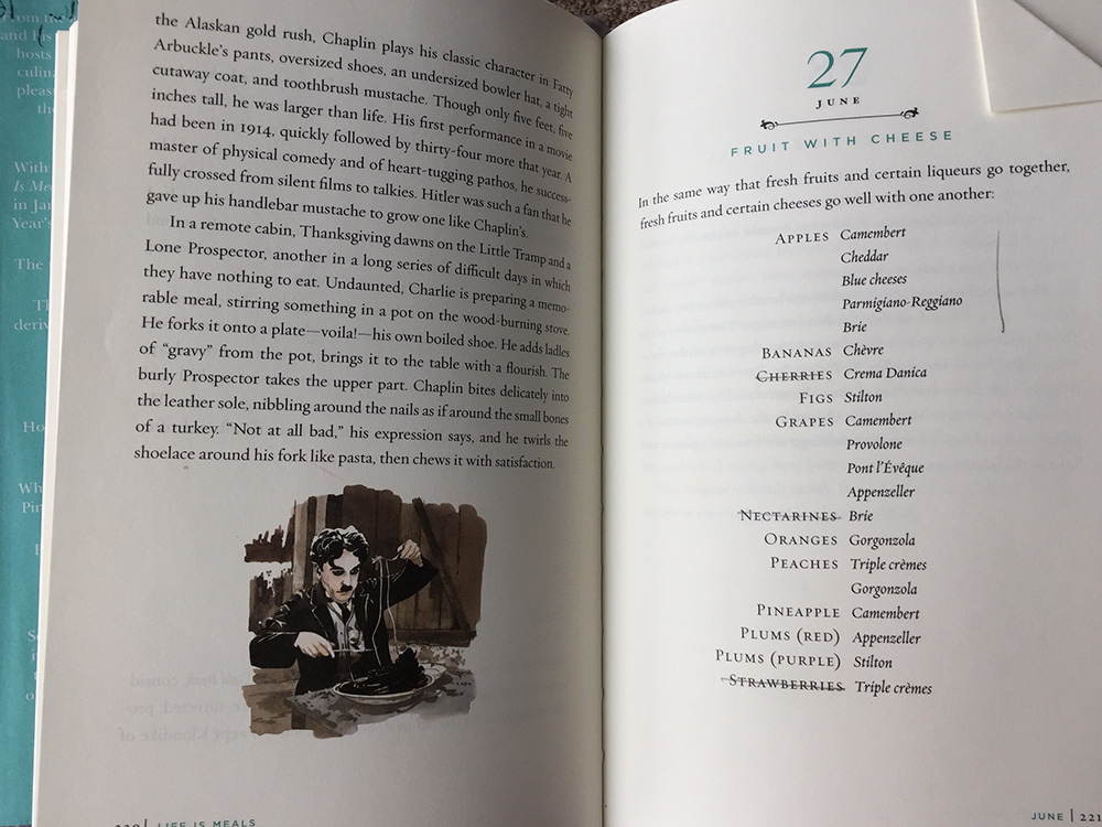The above photo reproduces the Salters’ recommendations of which fruits to serve with which cheeses. I served apples with Roquefort, bananas with chèvre, grapes and pineapple with Camembert, plums with Appenzeller, and strawberries with a stinky, melty Èpoisses—a cheese from Burgundy, a Salter locale—though that wasn’t sanctioned by the chart in Life Is Meals. None of it really seemed to work, but it was an interesting experiment.