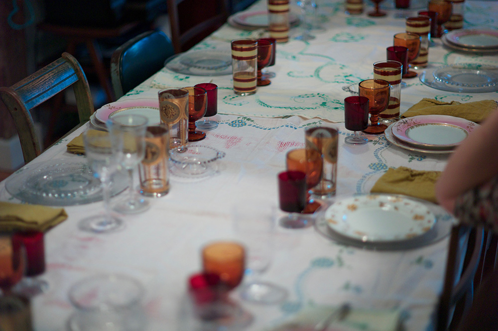 My dinner table, ambitiously set for fourteen, with embroidered tablecloths as mentioned in Life Is Meals.