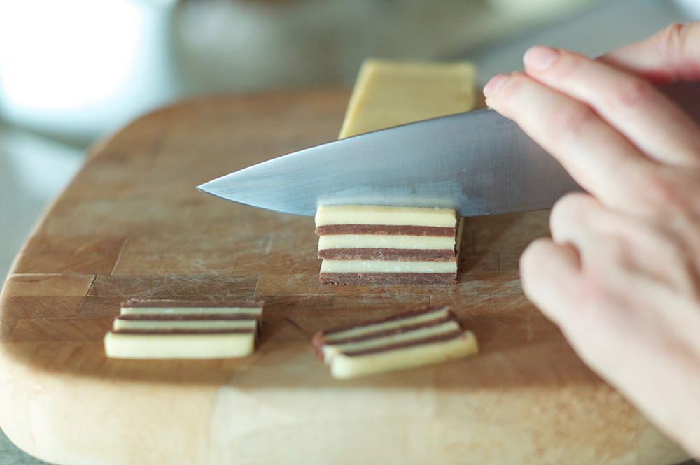 To assemble the cookies, set the white-chocolate rectangle on the worktop or cutting board. Peel off the top sheet of plastic wrap from the dark-chocolate rectangle, and invert it on top of the white-chocolate dough. Gently press the two doughs together. Peel off the uppermost sheet of plastic wrap. Using a large sharp knife, neaten up the rectangle so it is exactly twenty by fifteen centimeters, then cut lengthwise into three strips, each twenty by fifteen centimeters. Stack up the strips to make a thin brick-like shape. Wrap and chill for twenty minutes.