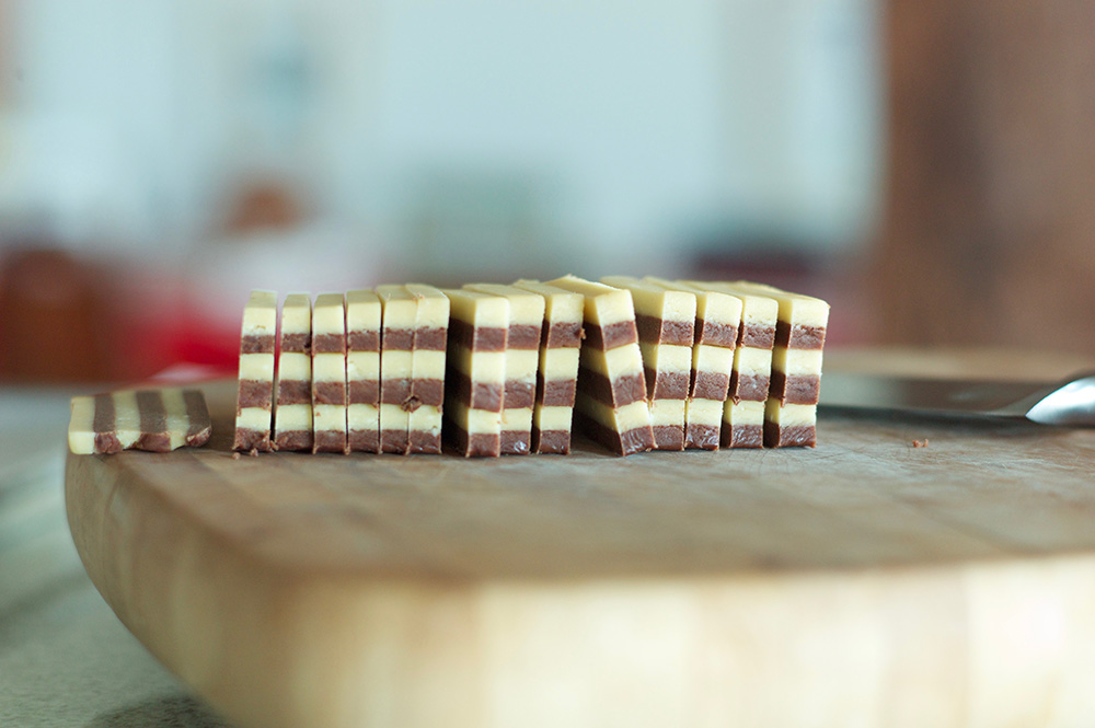 Form the white-chocolate dough into a brick-like shape, and set between two sheets of plastic wrap. Roll out to a twenty-by-fifteen-centimeter rectangle. Slide onto a tray, and chill for thirty minutes. Repeat with the dark-chocolate dough.