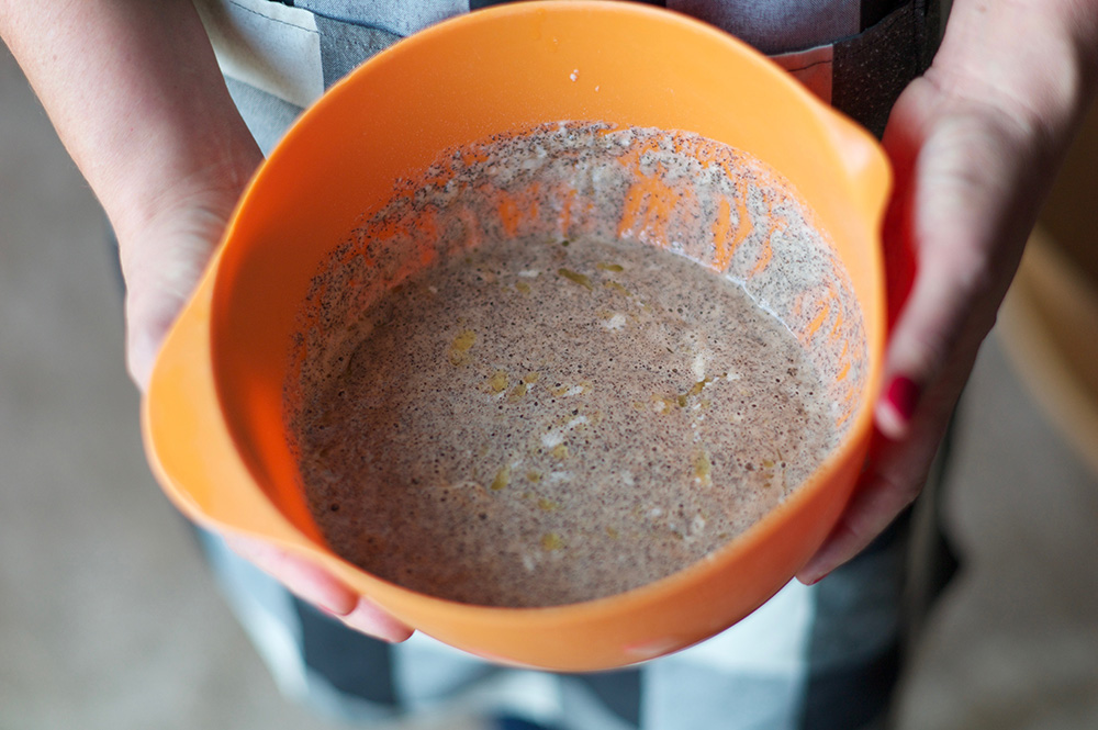 Add salt and the all-purpose and buckwheat flours, then stir in the milk, three tablespoons of the butter, and the eggs. Cover, and let sit in a warm place for forty-five minutes to an hour, until it increases in volume, has bubbles breaking the surface, and is stringy when scooped.