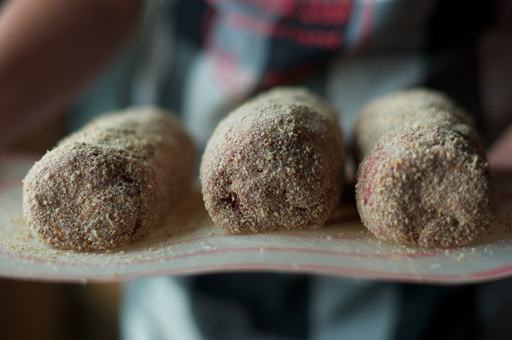 Shape meat into a firm, round ball, then roll into a salami-like loaf about two and a half inches in diameter. Roll the loaf in the bread crumbs until evenly coated.
