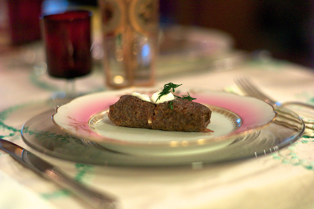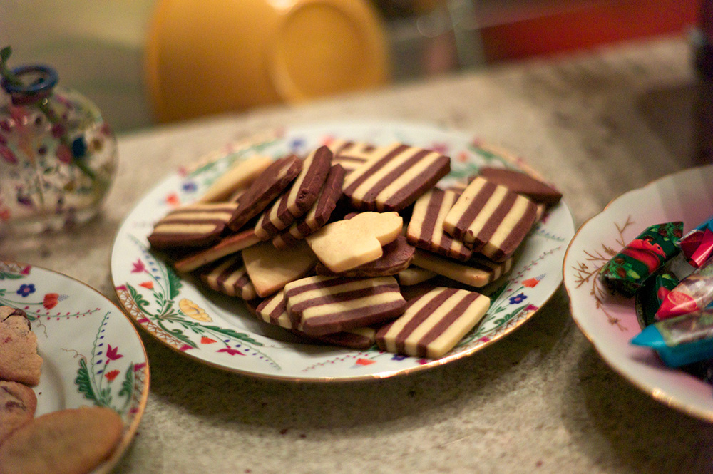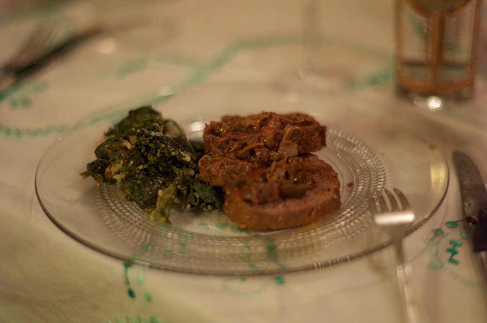 From Salter, I made buckwheat blini stuffed with smoked salmon, though I altered his recipe to make it work better for me (more liquid and a nonstick pan). Following that, I served a green salad, dressed with his “house dressing,” which he claimed is “the one” for “nine out of ten salads.” It relies on red-wine vinegar and Dijon mustard, and I found it a bit generic. My main course was Marcella Hazan’s polpettone alla Toscana, aka meat loaf with mushroom sauce, a dish Salter said made “an incredible impression” at his parties. Meat loaf isn’t quite chic in this day and age, but it seems an appropriate nod to his heyday as a novelist in the sixties and seventies. I served mine with a side of broccoli rabe, made with ingredients probably not available to him, like Aleppo pepper and preserved lemon. For the dessert course, I prepared an abundant cheese board, following a chart from Life Is Meals that matched cheeses to fruits. I deliberately included some pairings (such as bananas with goat cheese) that sounded weird—and, my guests confirmed, were indeed weird—but we all had fun trying them. To finish the meal, there were fanciful striped zebra cookies from a favorite recipe of mine.