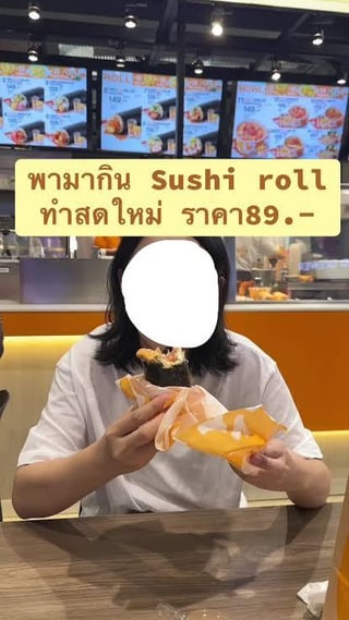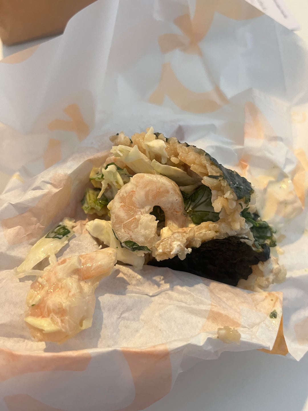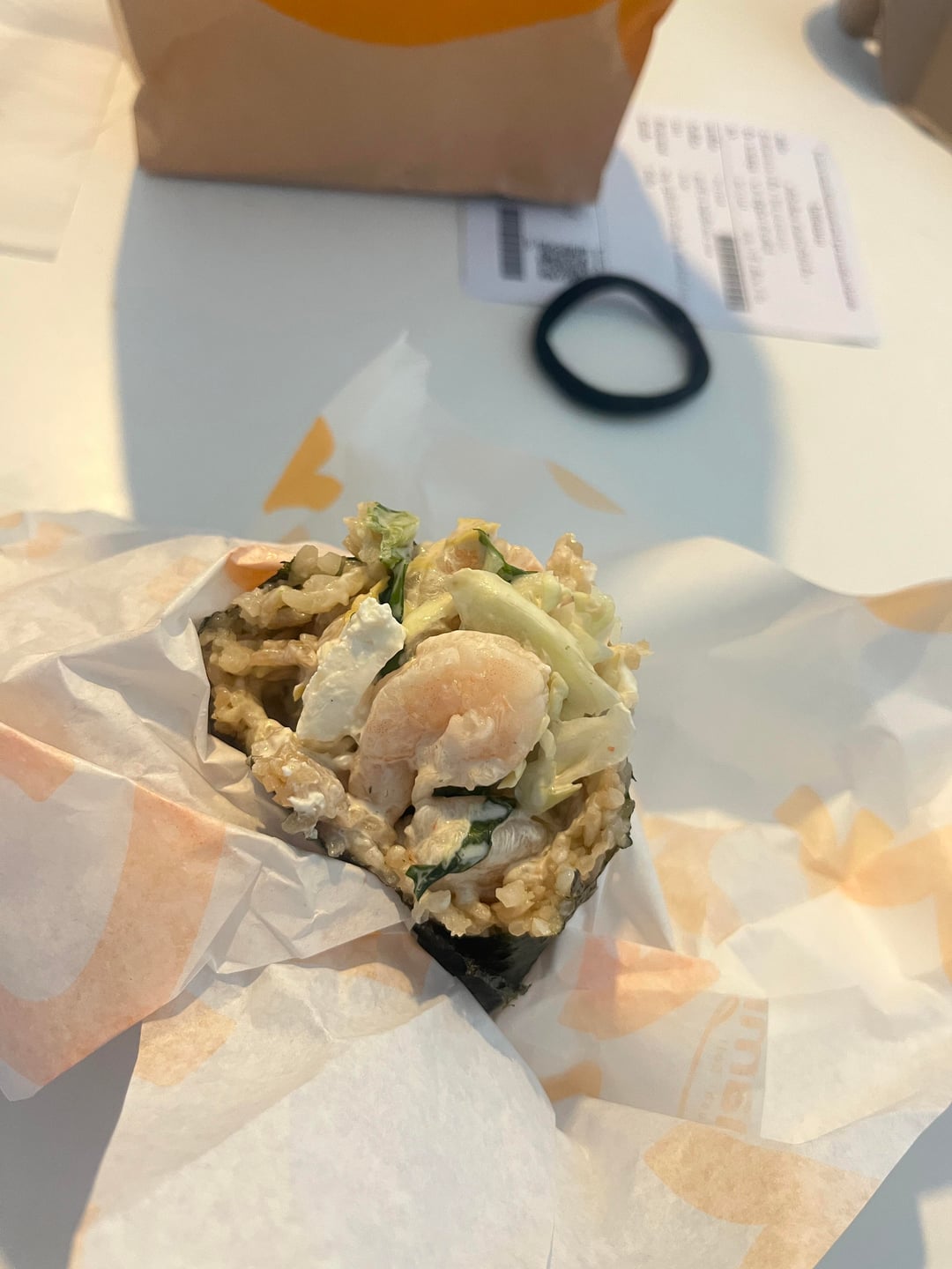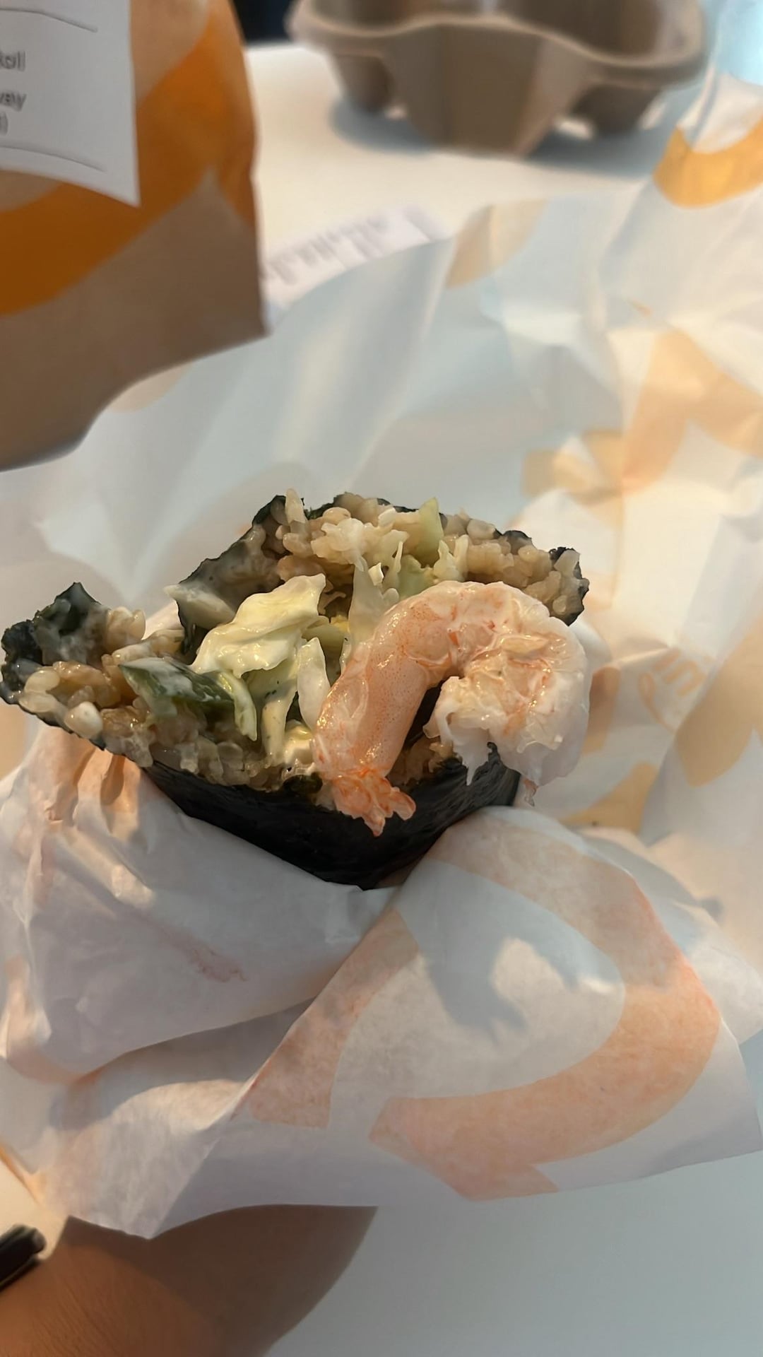 sorry i dont have full roll pic ๐ but the last pic looks like mine when i had two bites out of it. It has shrimps, cream cheese, some veggies idk what type, rice, tartar sauce, seaweed. I weighed it and itโs 205g.
