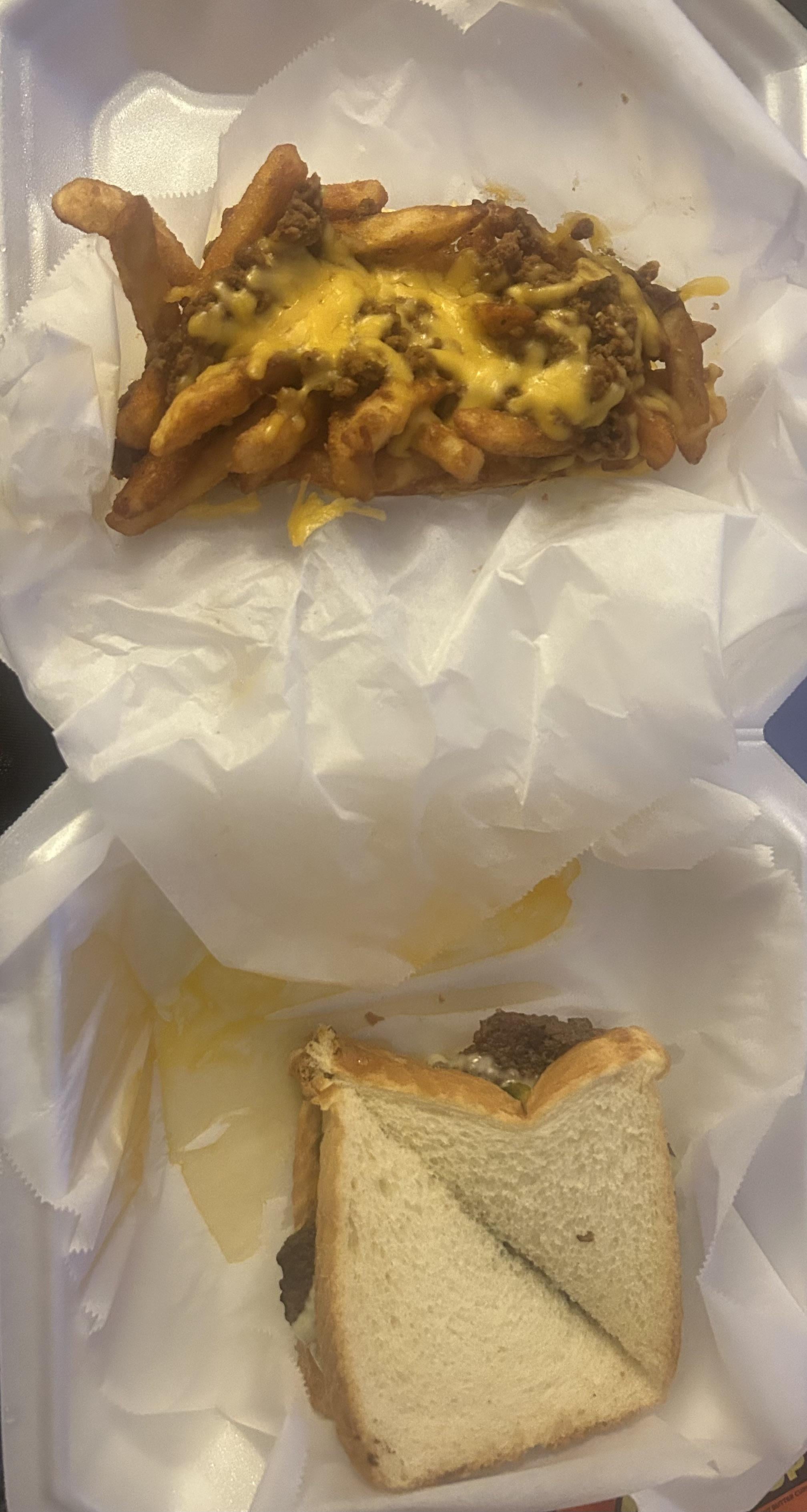 Went several weeks ago. This was $18. Patty Melt and supposedly the side order of chili fries. Delivered in a single container. The interior of the restaurant is as appealing as the food. That’s what I get for getting door dash pickup at a new (to me restaurant). Stay away.