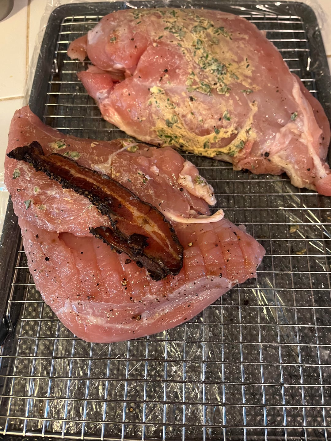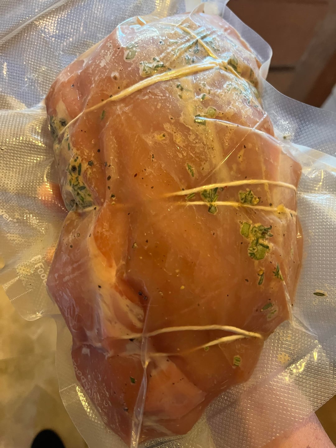 Ok well after years of Thursday madness decided what the heck and trying my hand at sous vide turkey breast. Had the butcher do his thing and break her down for me. Got skin laid out in freezer to crisp up Thursday(please tell that will work out). The breast bone will be roasted to make some stock. Turkey spent last night dry brining and today slathered a little compound butter with a little bacon grease on it. Maple peppered bacon slice sandwich between before tying her up and dropping her in 145 degree bath. Off to the store to grab a 5lbs bag of ice to ensure proper chilling.