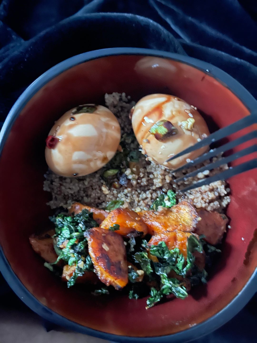 Marinated Eggs, quinoa, sautéed sweet potatoes and kale
