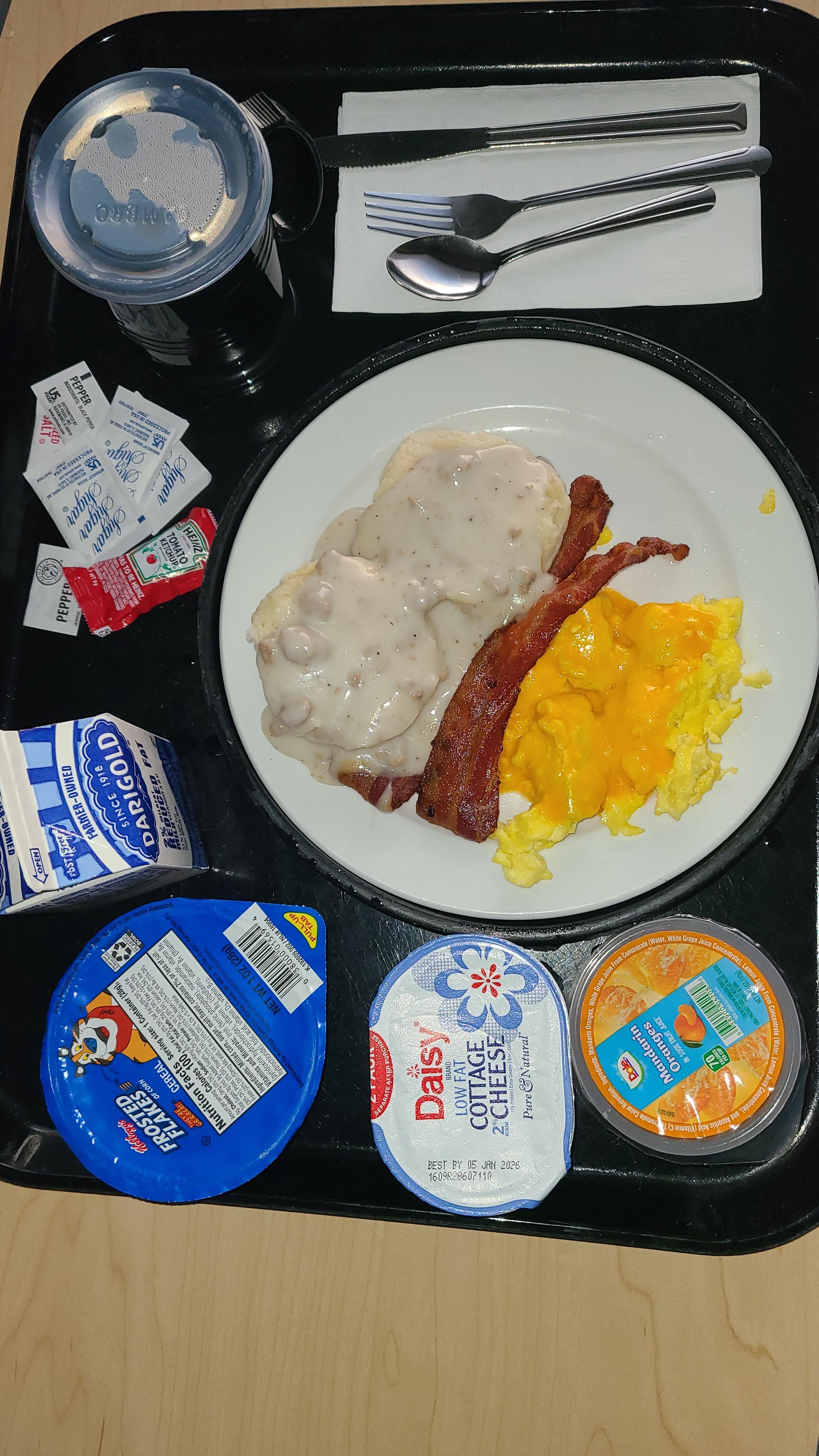My choice for hospital food breakfast this morning while recovering from cancer surgery. Biscuits and gravy, scrambled eggs with cheese, bacon, frosted flakes, cottage cheese & mandarins slices