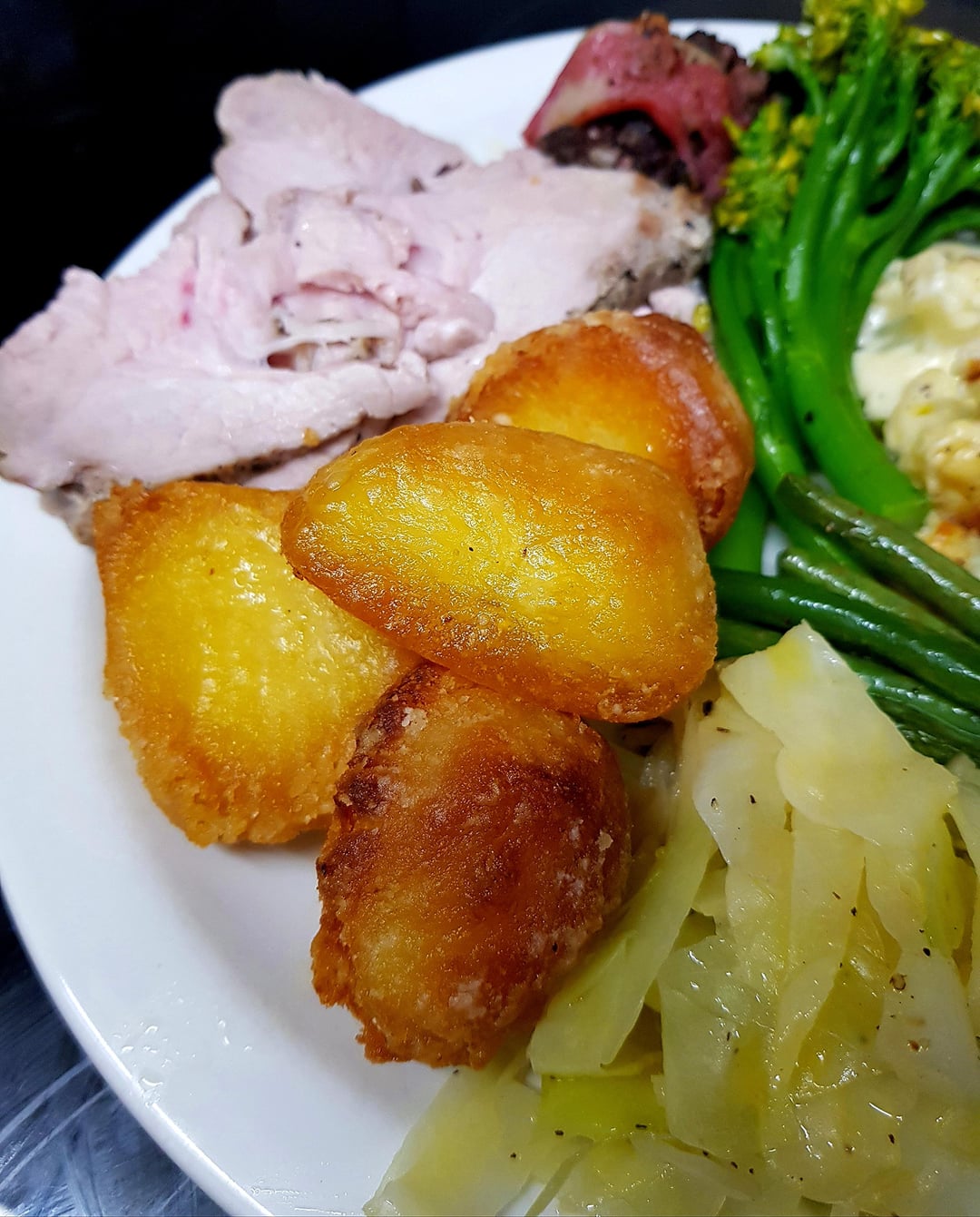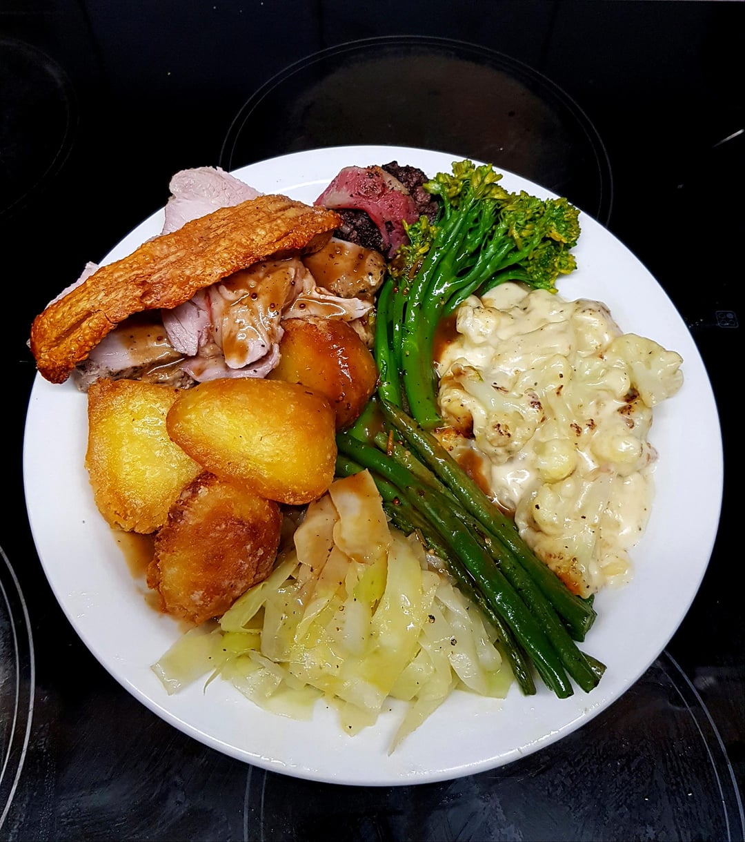 Roast Pork Shoulder, Duck Fat Potatoes, Blue Cauliflower Cheese (Mild), Buttered Cabbage, Green Beans and Broccoli, Stuffing and Bacon and Mustard Cider Gravy. And Crackling, Obviously.