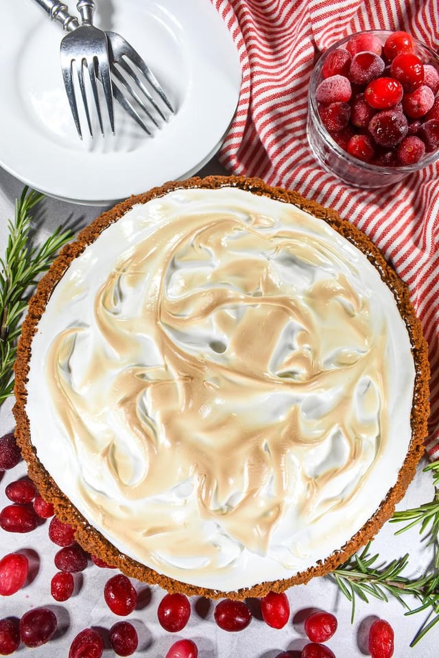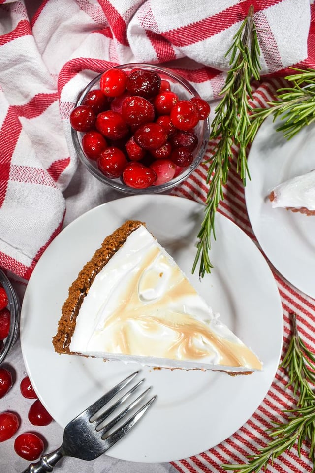 Cranberry-orange curd nestled inside a homemade gingersnap crust and piled high with swirls of Italian meringue.