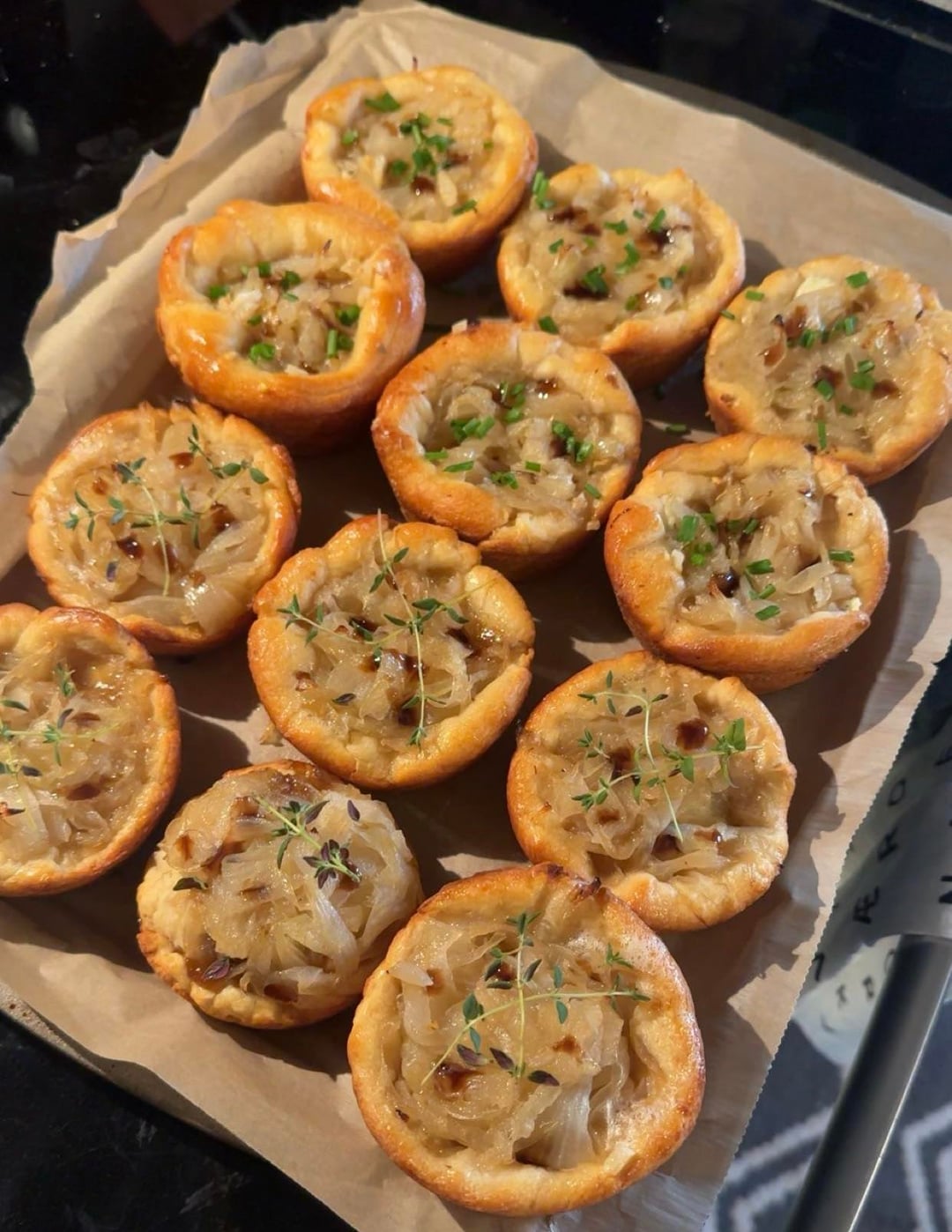Onion pastries with balsamic onion jam, boursin cheese, and fresh herbs. Garlic butter crust.