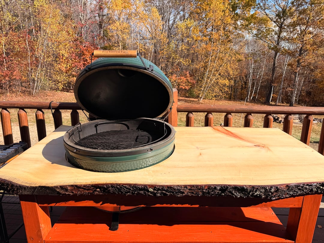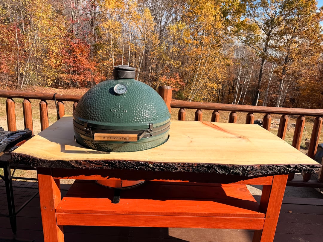 I was planning a table for my XL and my local lumber yard had this 38” pine slab. This is actually only half the slab, so I’ll definitely be making a second table for my second egg in the spring. by charrondev 6 Comments FlufferMcStuffins 6 hours ago Looks good. That’ll absolutely burn around the egg. I’d route the edge back a bit and add some kind of shielding. Gloomy-Employment-72 6 hours ago Hate it. Throw it on the scrap heap and I’ll take it to the dump for you. cfreezy72 6 hours ago Not enough air gap between the egg and table. mateomalo 5 hours ago Nice bark. grill_sarg 5 hours ago Very nice, love the live edge look. Bachness_monster 5 hours ago Absolute fire, both aesthetic and literal future