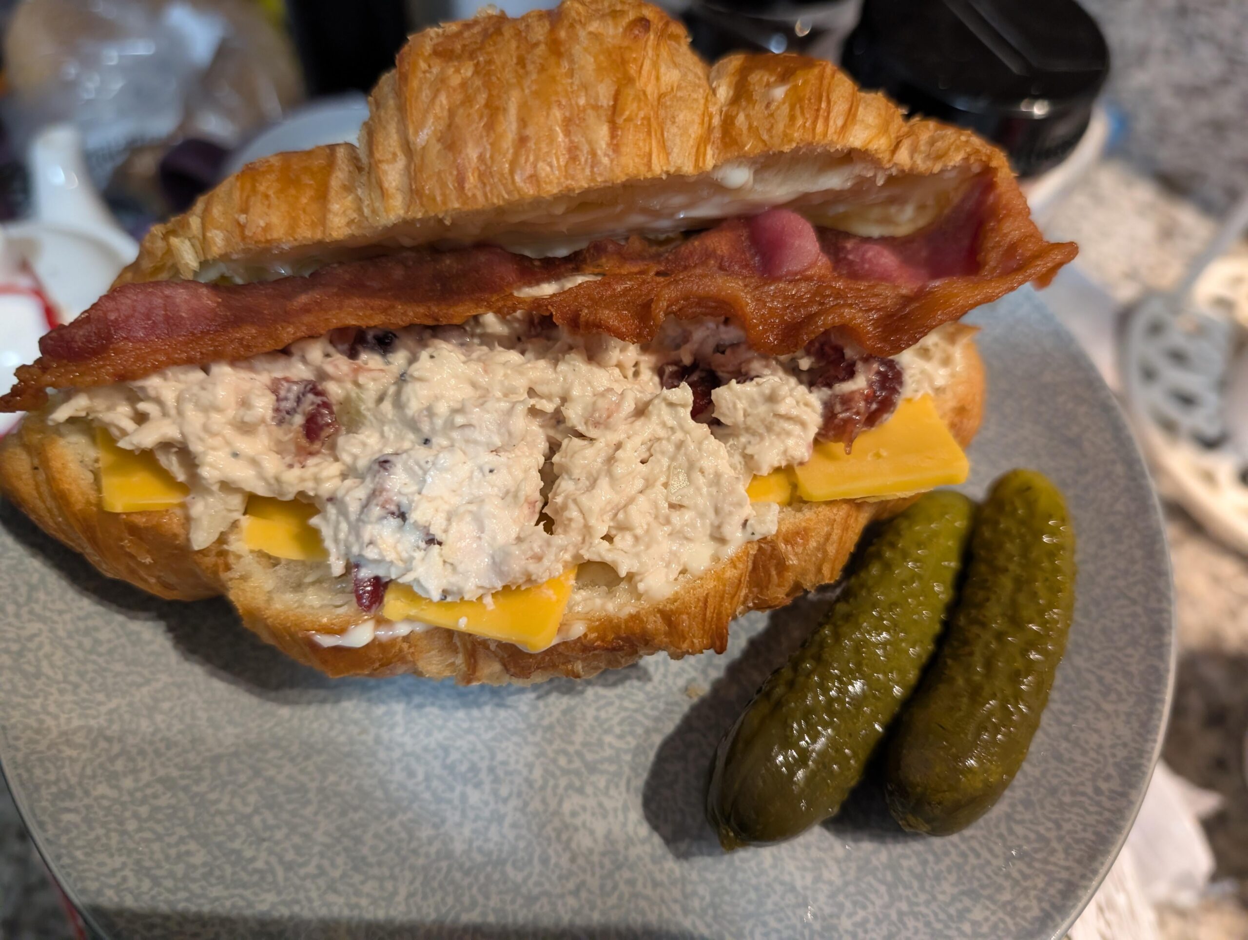 I made it Saturday and it just keeps getting better. I got dried cranberries and pecans with onion and celery in my chicken salad. Sliced up some cheddar cheese and added it with a piece of bacon 🥓🤤