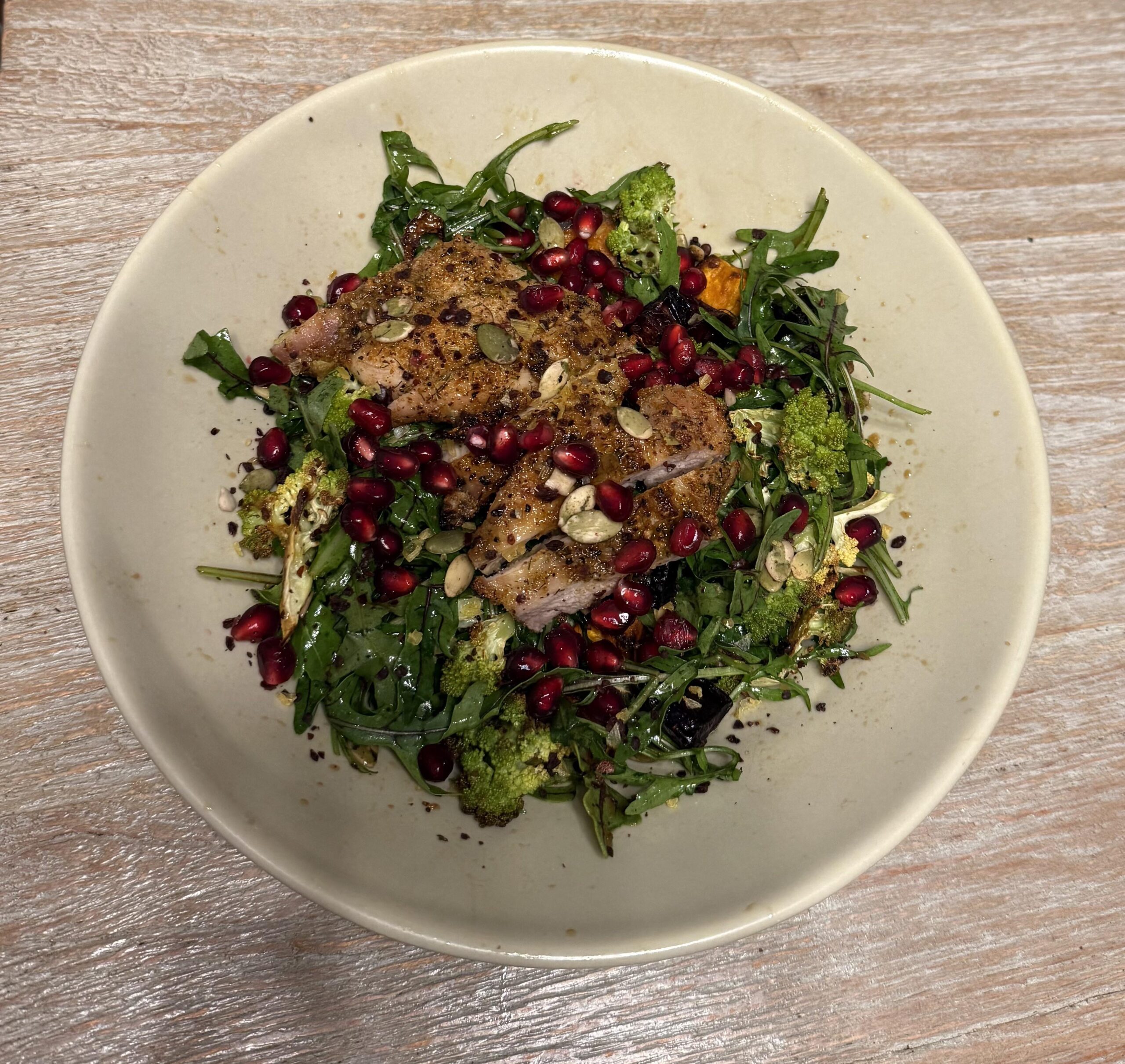 Salad for dinner. A base of arugula. Roasted veggies: sweet potatoes, purple carrots and romanesco cauliflower. Pumpkin seeds. Golden raisins. And some pomegranate seeds to finish.