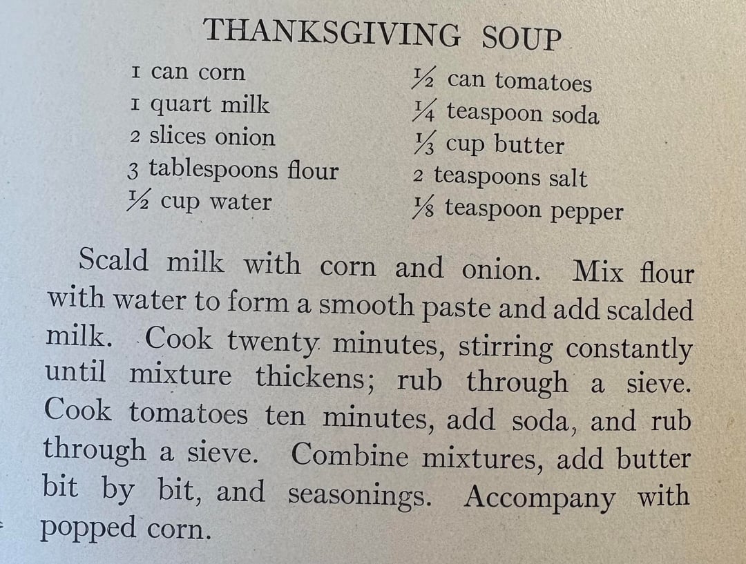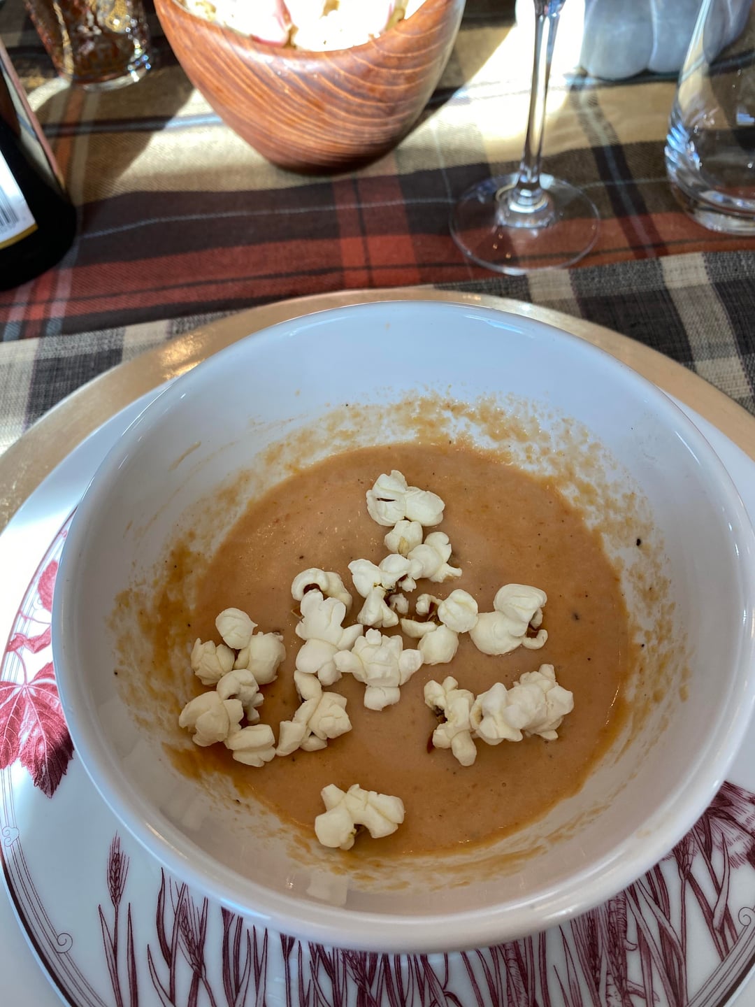 I made the soup a few years ago and it’s pretty tasty! Ends up tasting almost like a seafood bisque. Pet the photographic evidence, I apparently put the popped corn in the soup at the time.