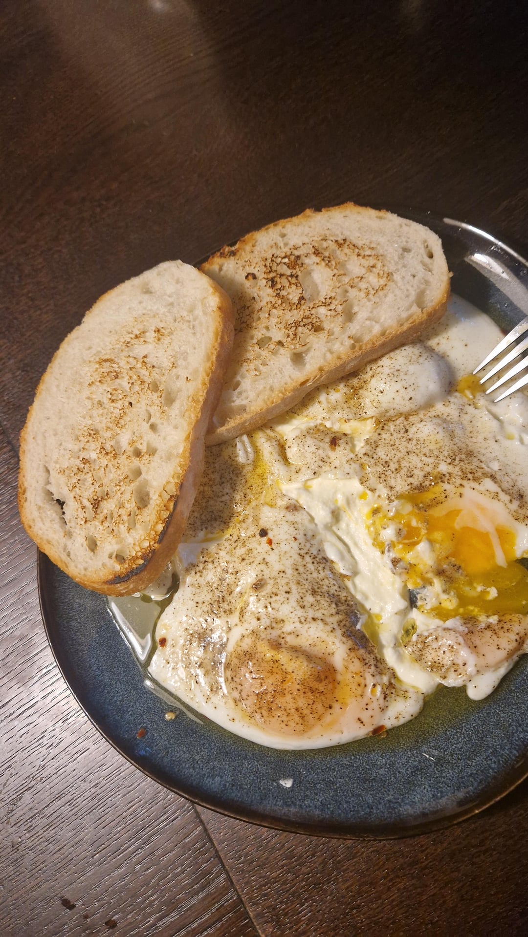 Fried eggs, Greek yogurt, butter with chili flakes and croutons
