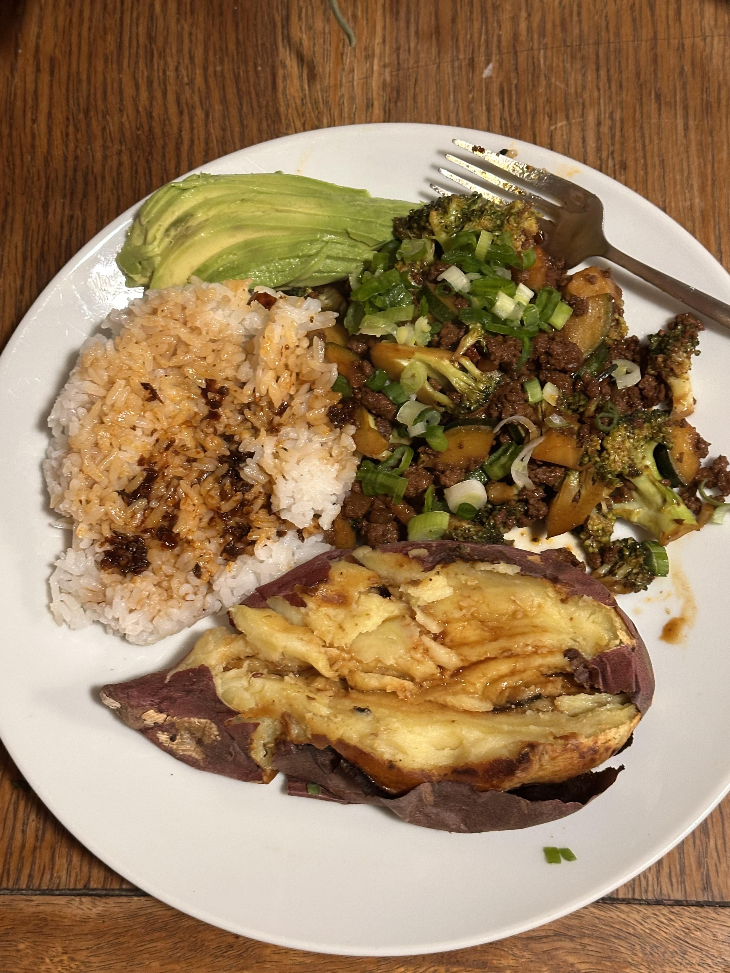 Beef stir fry (recipe in last post) Korean sweet potato avocado and white riceby Dontbejaded Dining and Cooking