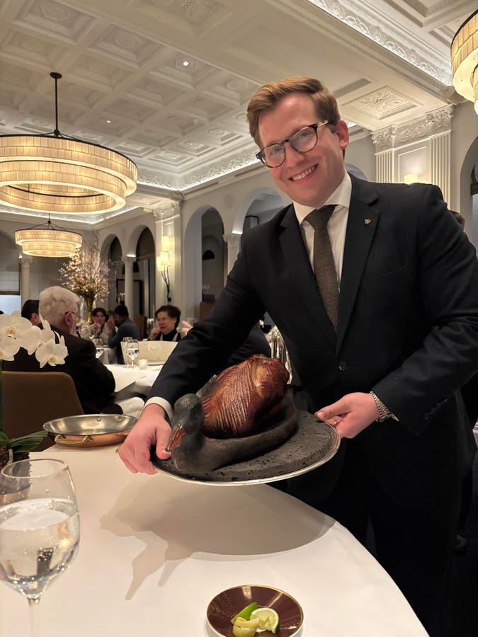 At Restaurant Daniel in New York City, Maître d’ Christopher Humberson presents the roasted duck before carving it.