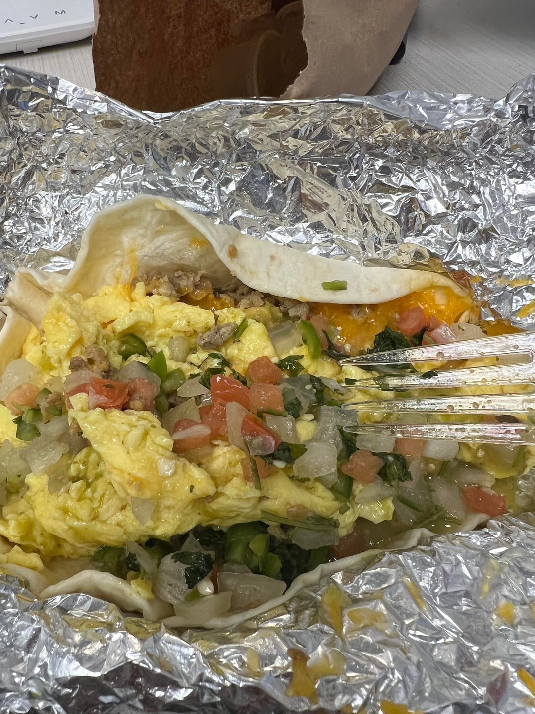 One bacon egg potato, one sausage egg cheese – get pico de gallo! Theirs is made with Serrano peppers and is delicious.