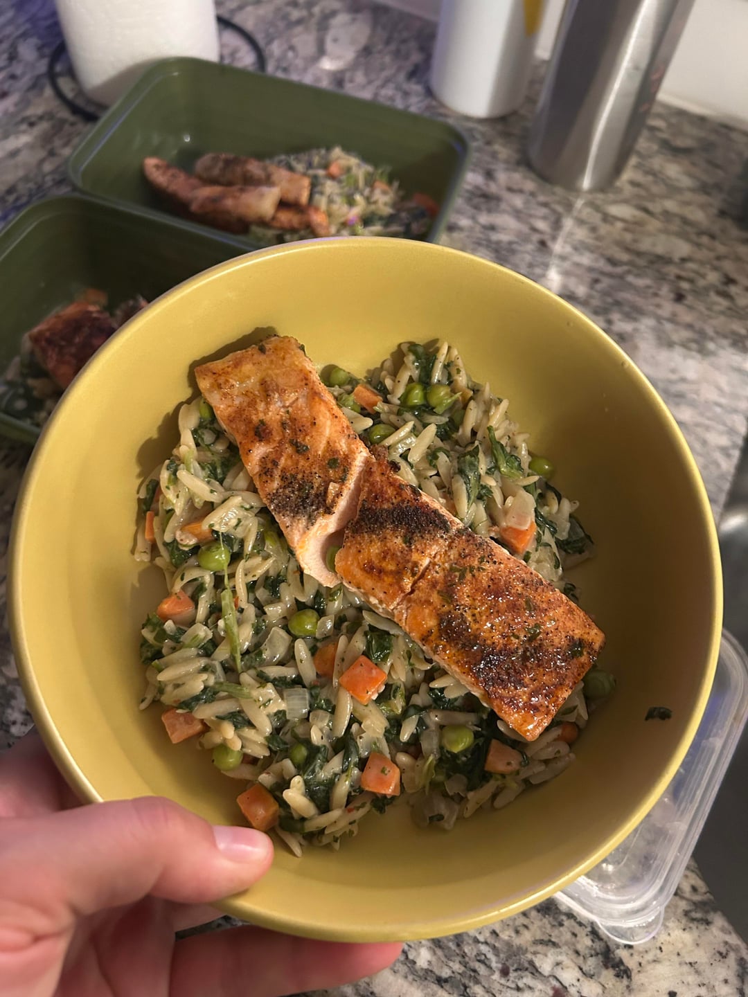 Melt butter and add garlic and onions, cook 2-3 minutes til fragrant. Add orzo, peas/carrots, spinach and rest of spices. toss to coat. Pour in cream, chicken bouillon (mixed with 1 cup hot water) and bring to a boil. Once boil lower to simmer and stir frequently so it doesn't stick to the bottom, 10-12. Add in lemon juice and top with salmon to finish cooking through.