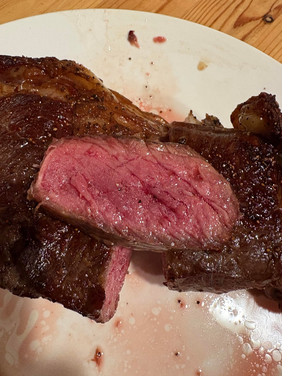 Cook looks impeccable. I flavor my steaks with 24hr dry brine, then reverse sear, and after I take the steak off I melt some butter and let it cook with some thyme and rosemary and pour it over the steak. Delicious every time imo