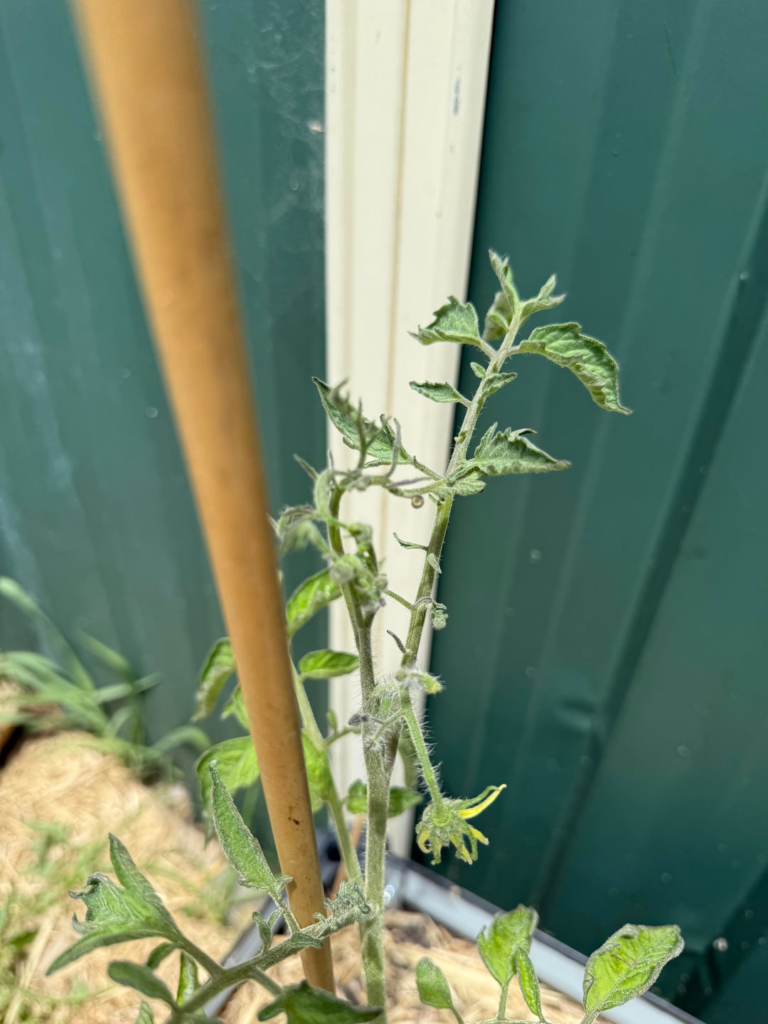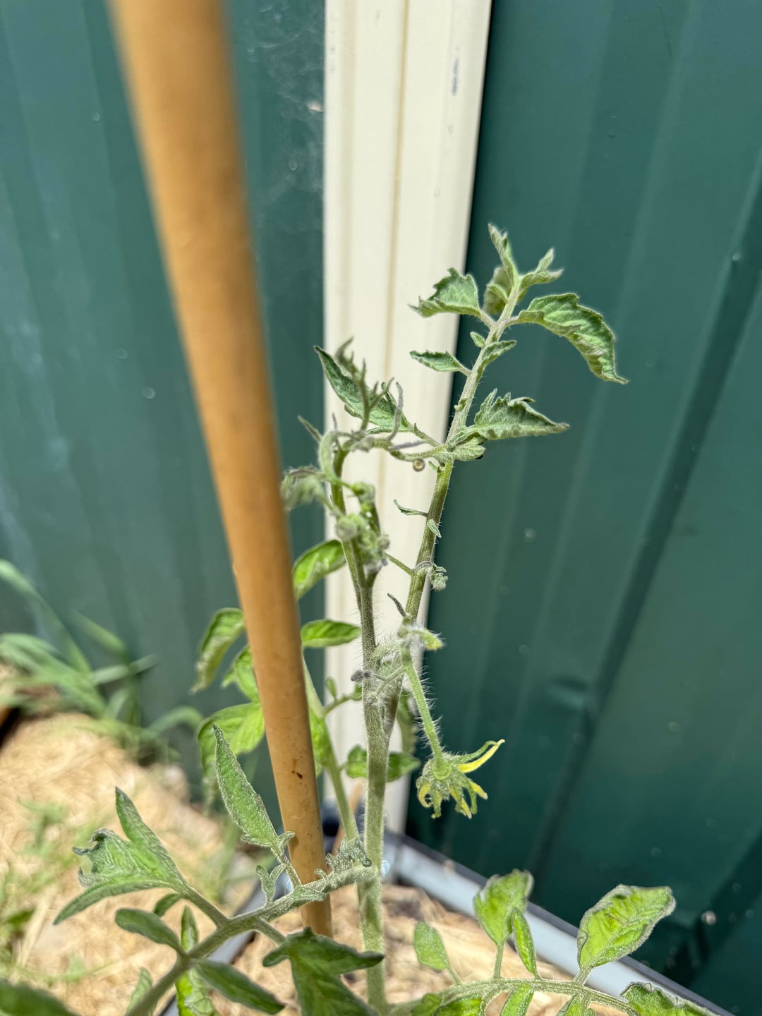 Only one tomato to show between six plants and lots of tiny flower buds that turn yellow and dry before opening and curly leaves/ new growth.