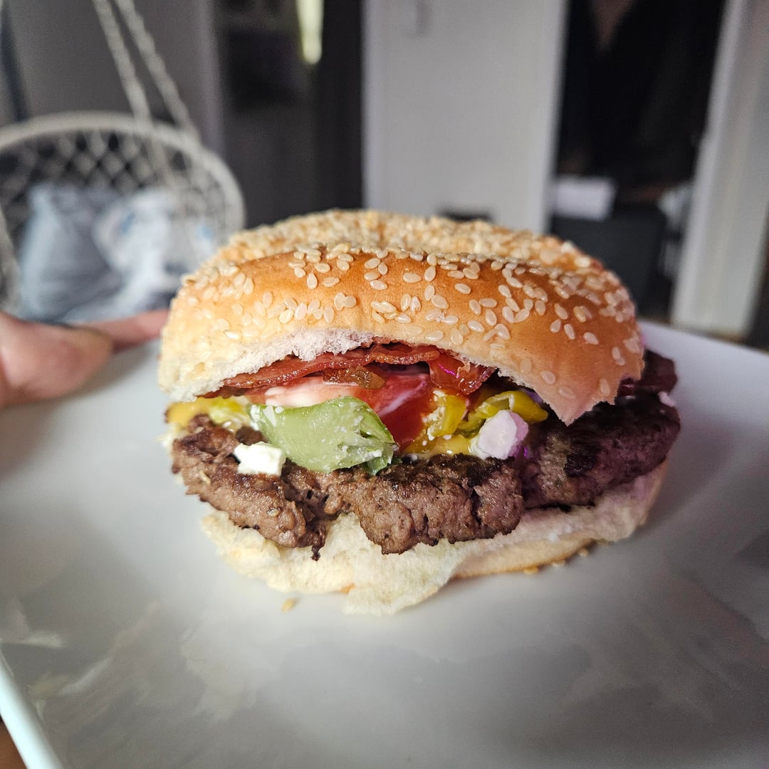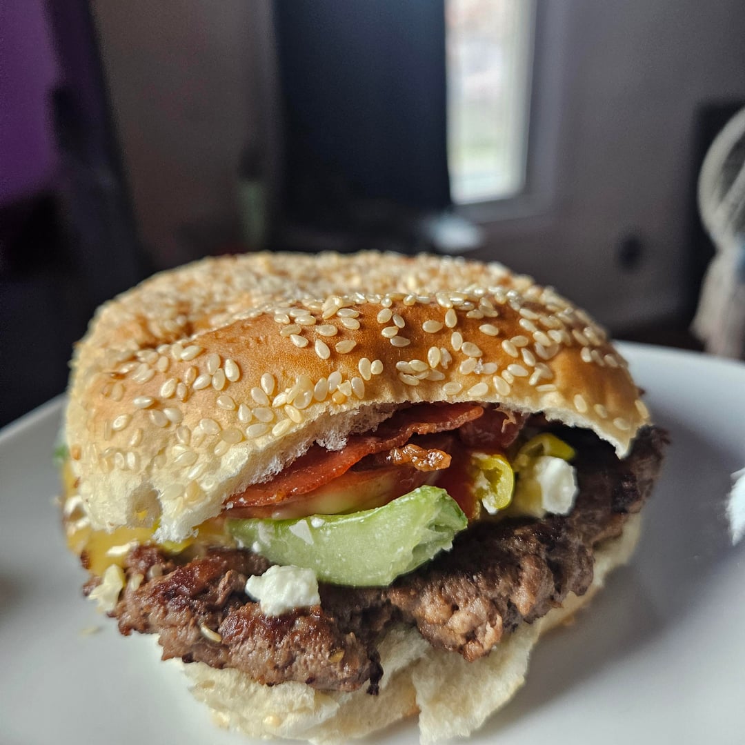 My weekly treat. I jazzed it up alittle with some feta and asiago crumbles. Yellow american, lettuce tomatoes and 5 crispy bacon strips. Lots of ketchup and mayo 😋