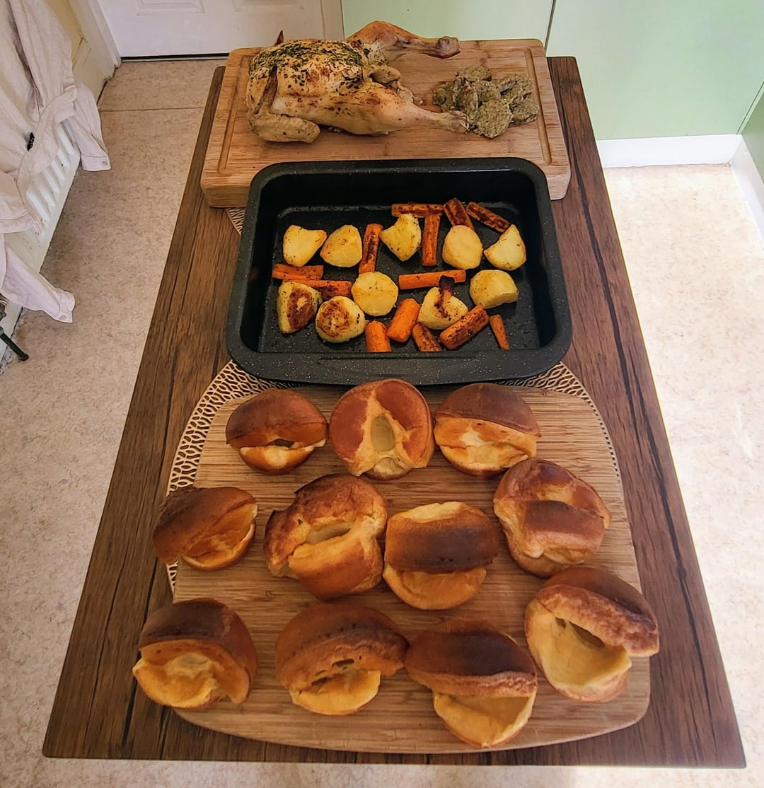 Pulled out all the stops for Sunday lunch today — roast chicken with herb stuffing, crispy roasties, carrots, broccoli, red cabbage, mash, and Yorkshires that actually rose like they meant it 🙌