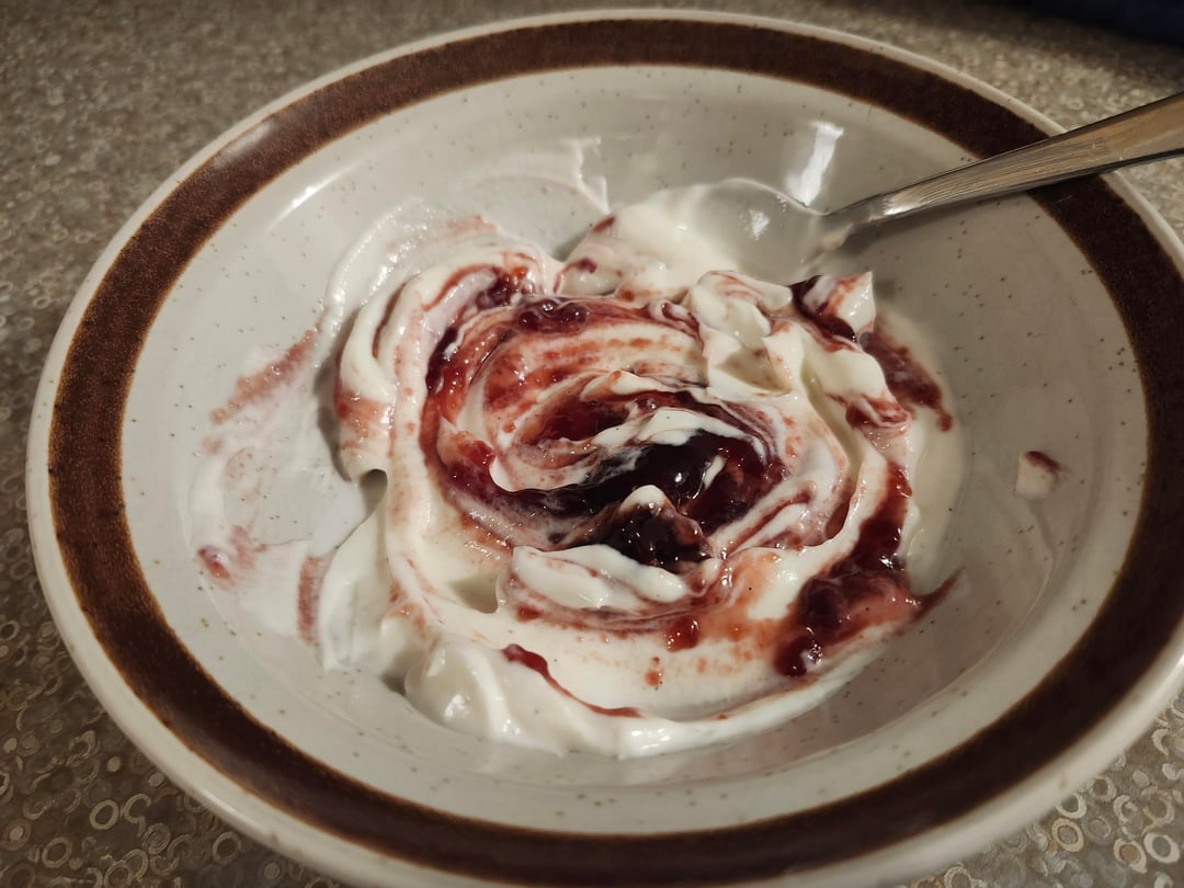 Lunch is just some high protein vanilla skyr with a little bit of morello cherry jam. (Half the listed serving size for each).